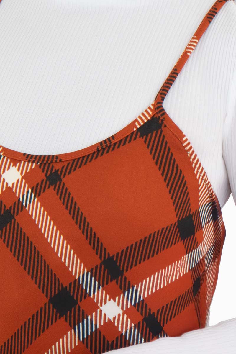 Renueva tu guardarropa con este encantador vestido corto estilo pichi a cuadros , una prenda versátil que viene con una playera blanca de manga larga integrada , ideal para lucir con estilo en climas frescos. El estampado de cuadros en tonos cálidos aporta un aire retro chic perfecto para el otoño, mientras que su corte favorecedor y cómodo lo hace ideal tanto para el trabajo como para salidas casuales.