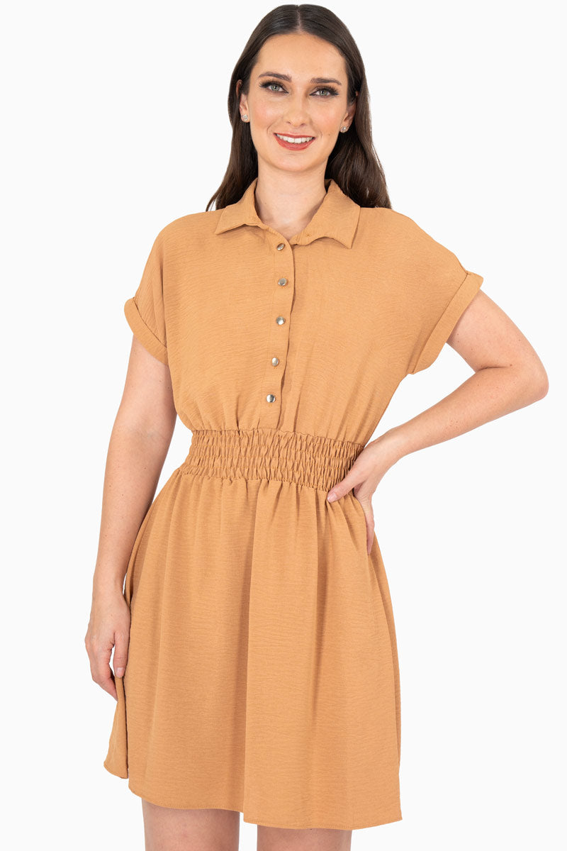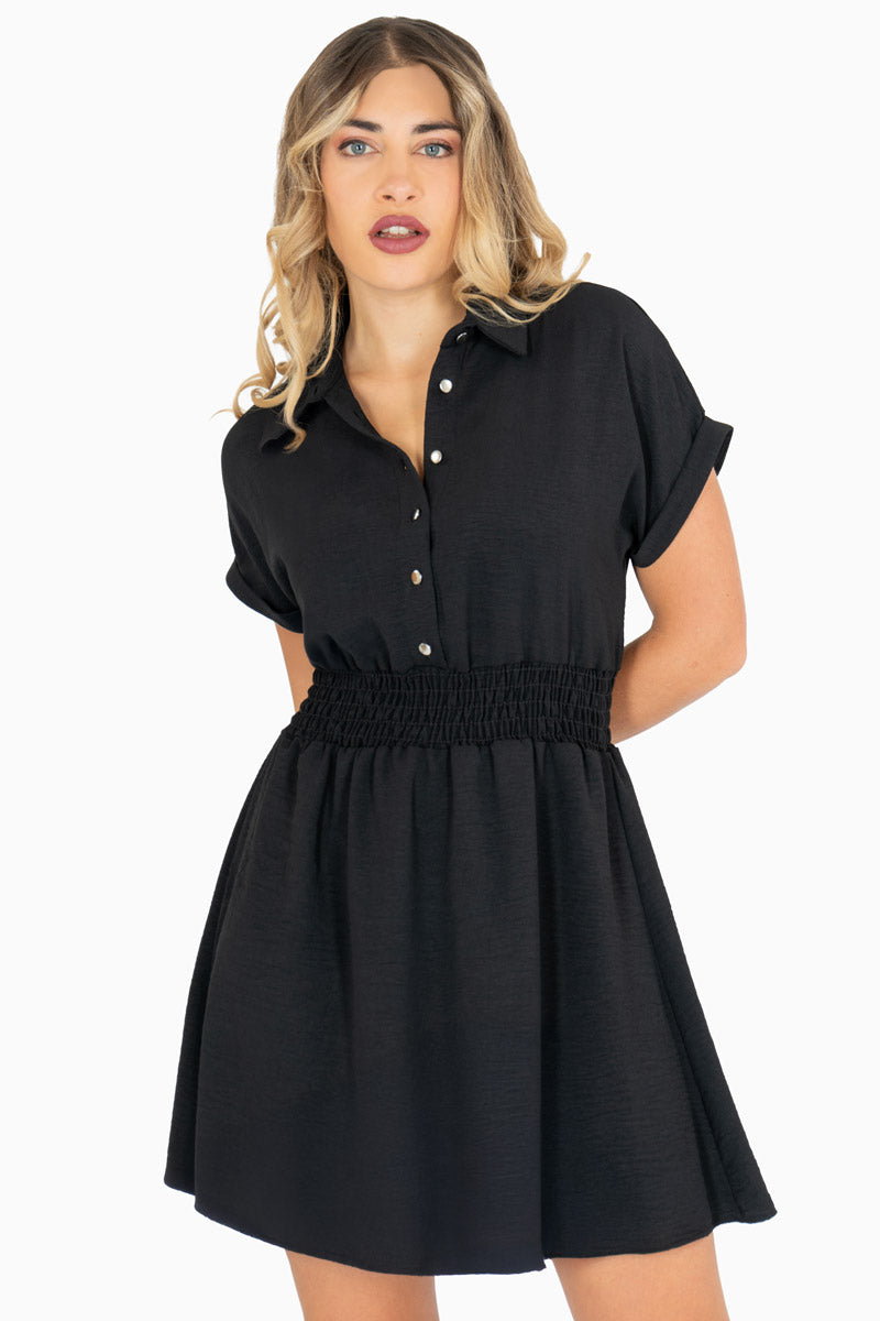 Este vestido corto es la elección perfecta para un look cómodo y con estilo durante el verano. Con un suave cuello polo, botones frontales y una cintura elástica que acentúa la figura, ofrece una silueta favorecedora y un tacto ligero y respirable. Su caída ligera y la falda ligeramente acampanada hacen que sea ideal para caminatas, almuerzos al aire libre o reuniones informales. Combínalo con sandalias o alpargatas para un look de resort chic o úsalo con una chaqueta ligera en eventos más frescos.