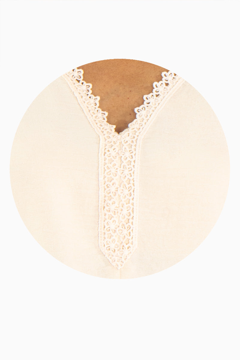 Esta blusa crema con delicado encaje es la adición perfecta a tu guardarropa. Su diseño elegante y femenino resalta la figura, mientras que el trim de encaje añade un toque de sofisticación. Ideal para ocasiones especiales o para un look casual chic, esta blusa combina versatilidad y estilo. Confeccionada en una suave tela, garantiza comodidad durante todo el día. No te pierdas la oportunidad de lucir radiante y a la moda con esta pieza imprescindible.