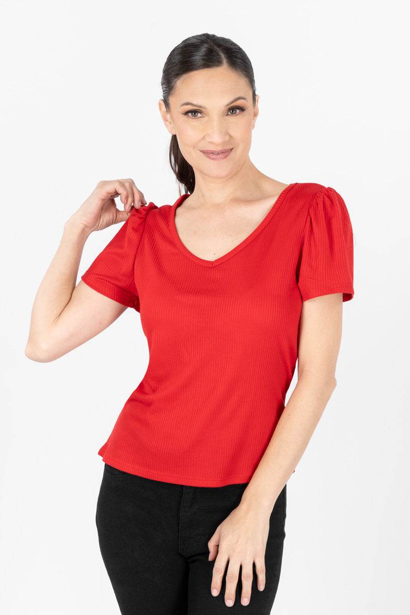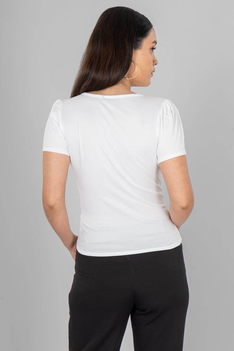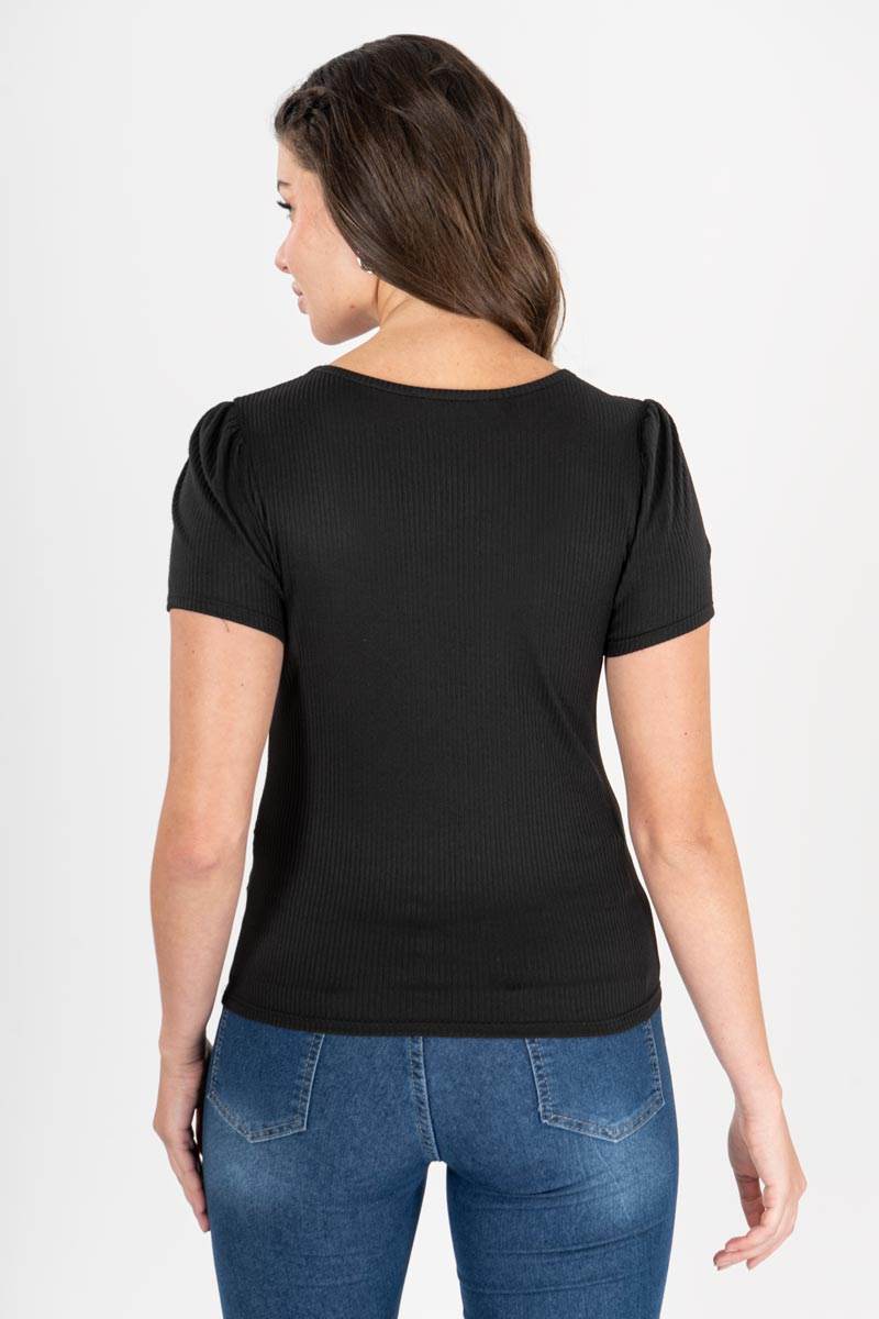 Blusa con mangas abullonadas cuello circular.