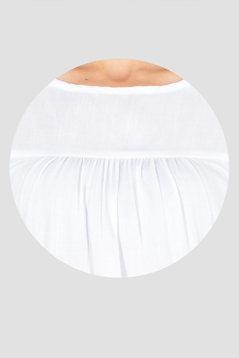 Esta blusa es una prenda esencial para cualquier guardarropa gracias a su diseño versátil y elegante. Confeccionada en una tela ligera y suave al tacto, ofrece una caída fluida que favorece la silueta sin ajustarse demasiado al cuerpo. El diseño incluye un delicado fruncido en la parte superior delantera que aporta textura y un toque femenino. Sus mangas cortas con vuelos añaden un detalle romántico, creando movimiento y ligereza al look. El cuello redondo es clásico y cómodo, ideal para llevar con collares sutiles o incluso sola para un estilo minimalista. Esta blusa es perfecta tanto para ocasiones casuales como para eventos más formales si se combina con pantalones de vestir o faldas.