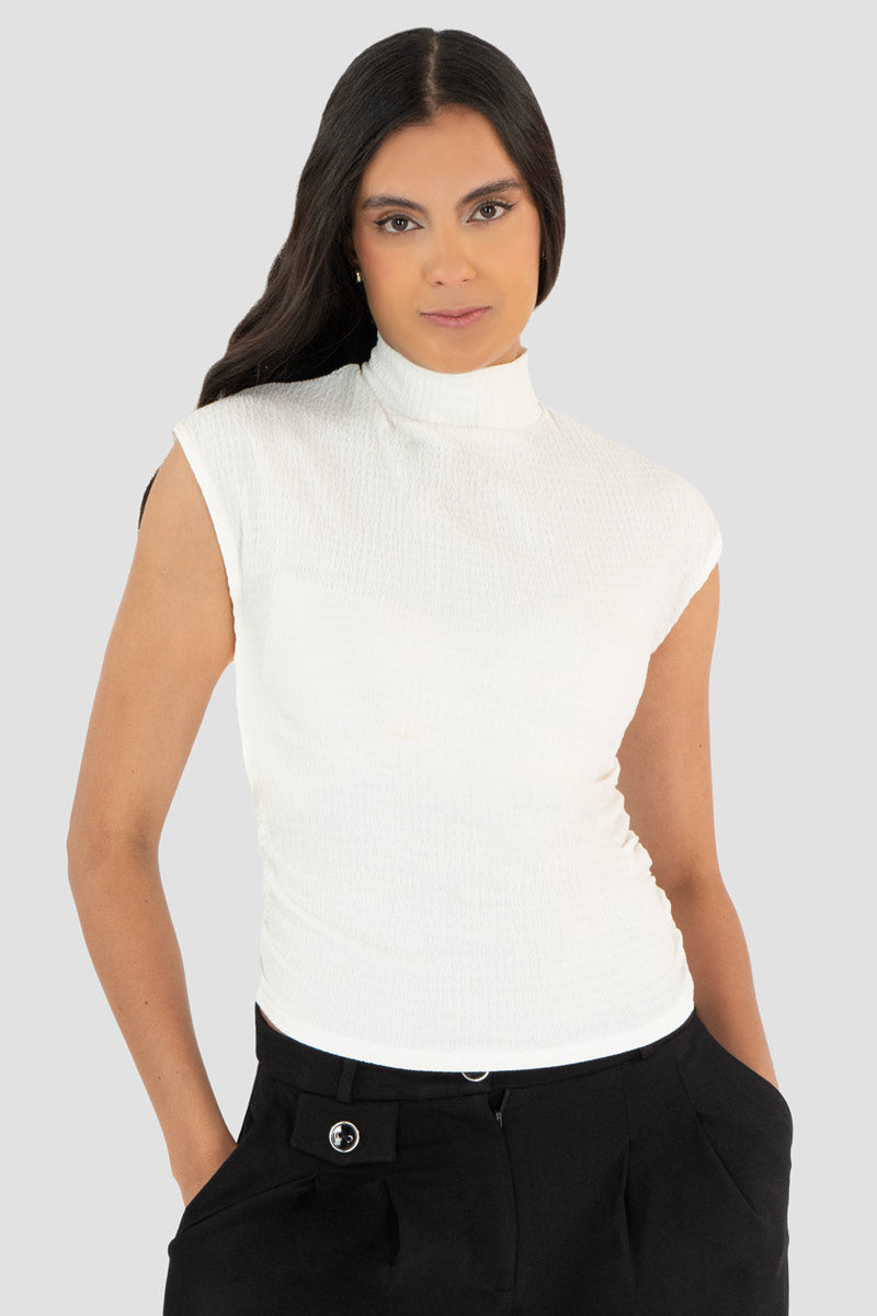 Descubre la versatilidad de esta blusa con cuello alto y sin mangas, una prenda esencial en el armario femenino. Su diseño ajustado al cuerpo estiliza la figura y aporta un aire sofisticado, ideal para combinar con jeans, pantalones de vestir o faldas. Gracias a su estilo minimalista, puede ser utilizada tanto para outfits casuales como para ocasiones más elegantes si la complementas con accesorios o un blazer. Una pieza básica que nunca pasa de moda y que se adapta a cualquier ocasión.