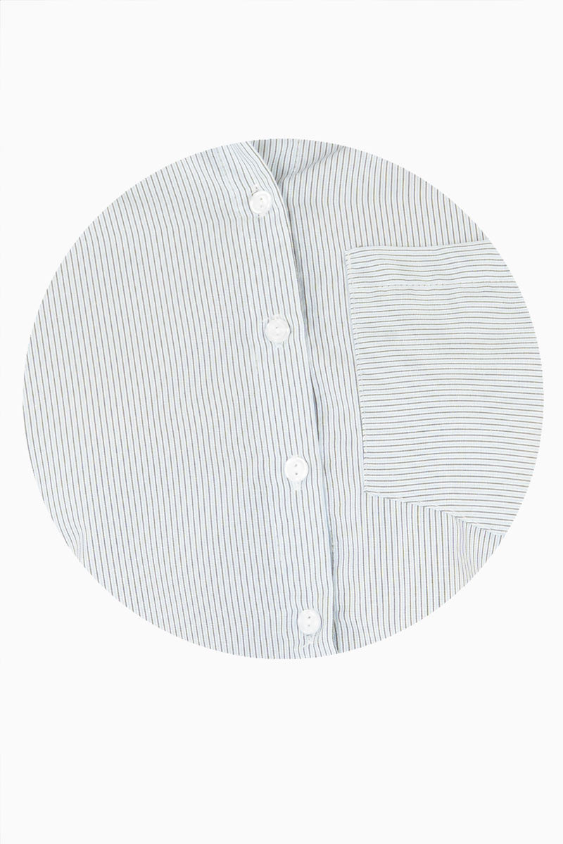 Su diseño presenta un clásico patrón de rayas finas en tonos suaves, que aportan un toque de sofisticación sin perder la esencia relajada. Cuenta  con botones frontales y un pequeño bolsillo en el pecho, que añade funcionalidad y estilo.