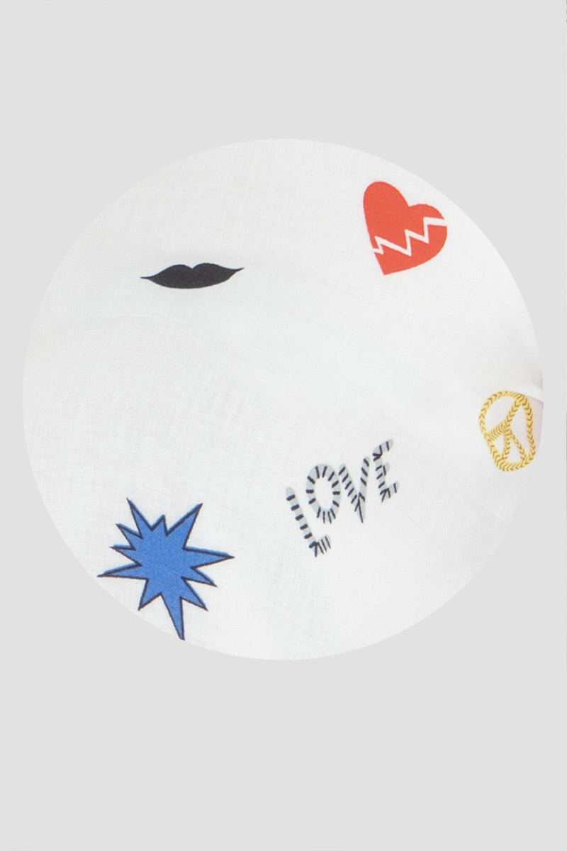Estampado vibrante con palabras como “LOVE”, íconos de paz, corazones y estrellas
