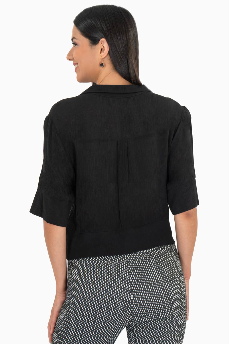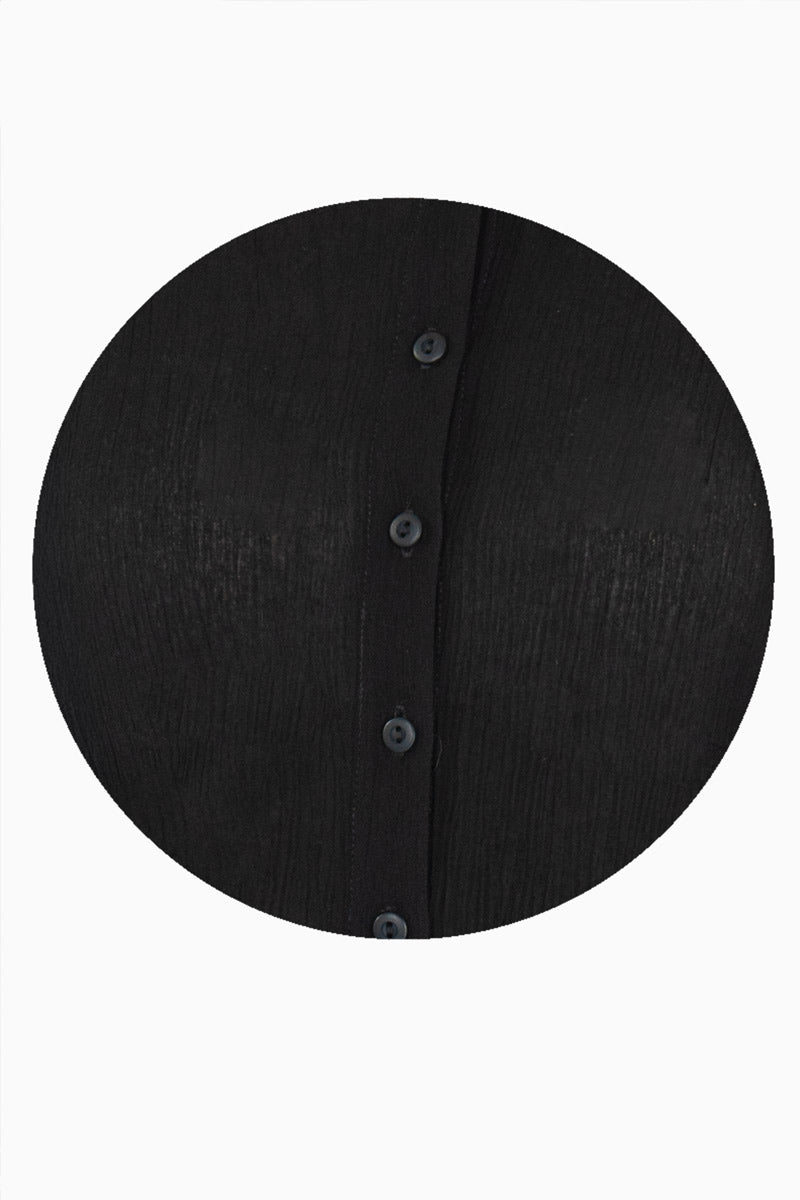 Esta camisa negra de botones combina elegancia con comodidad. Con un corte recto y mangas cortas ligeramente sueltas, es ideal para crear outfits formales o semiformales. El tejido tiene una textura sutil y ligera que brinda frescura y distinción. Su diseño clásico con cuello camisero y botonadura frontal la convierte en un básico imprescindible