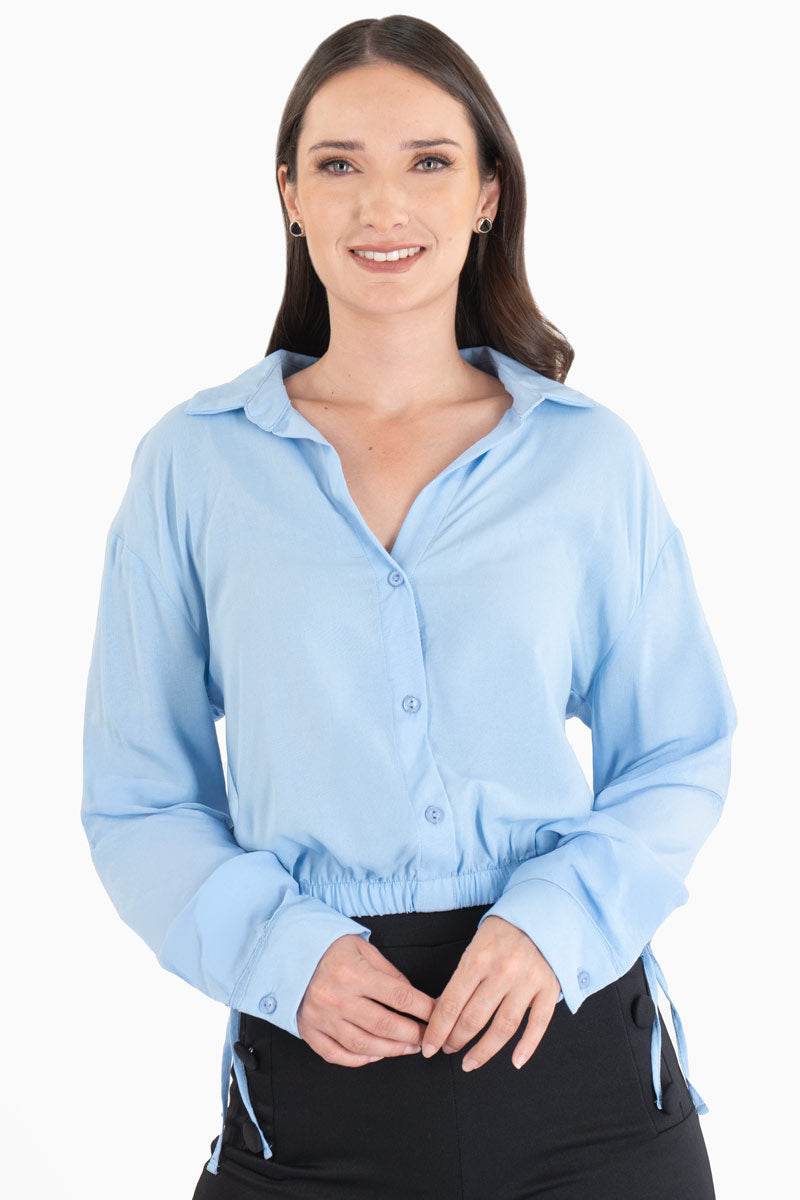 Camisa lisa manga larga con jaretas en costados.