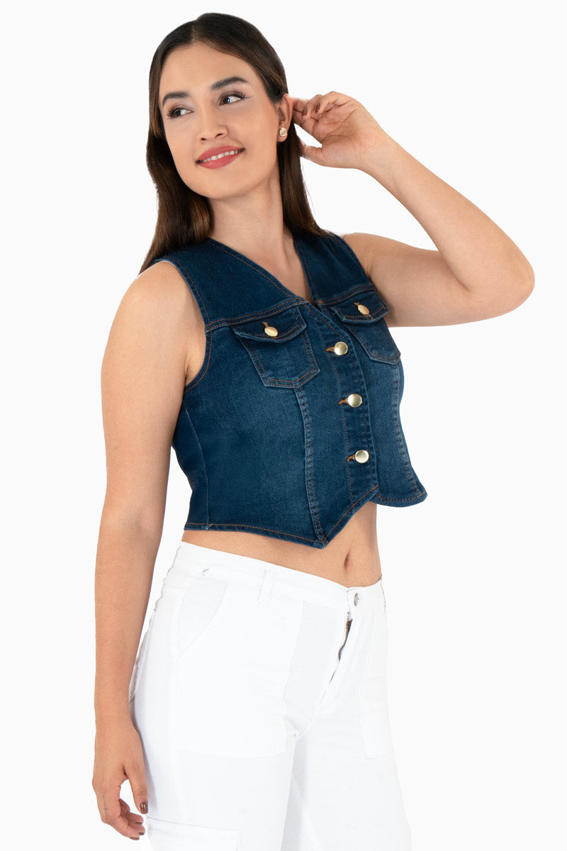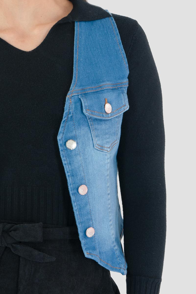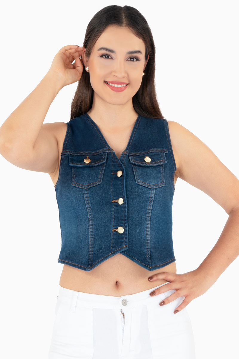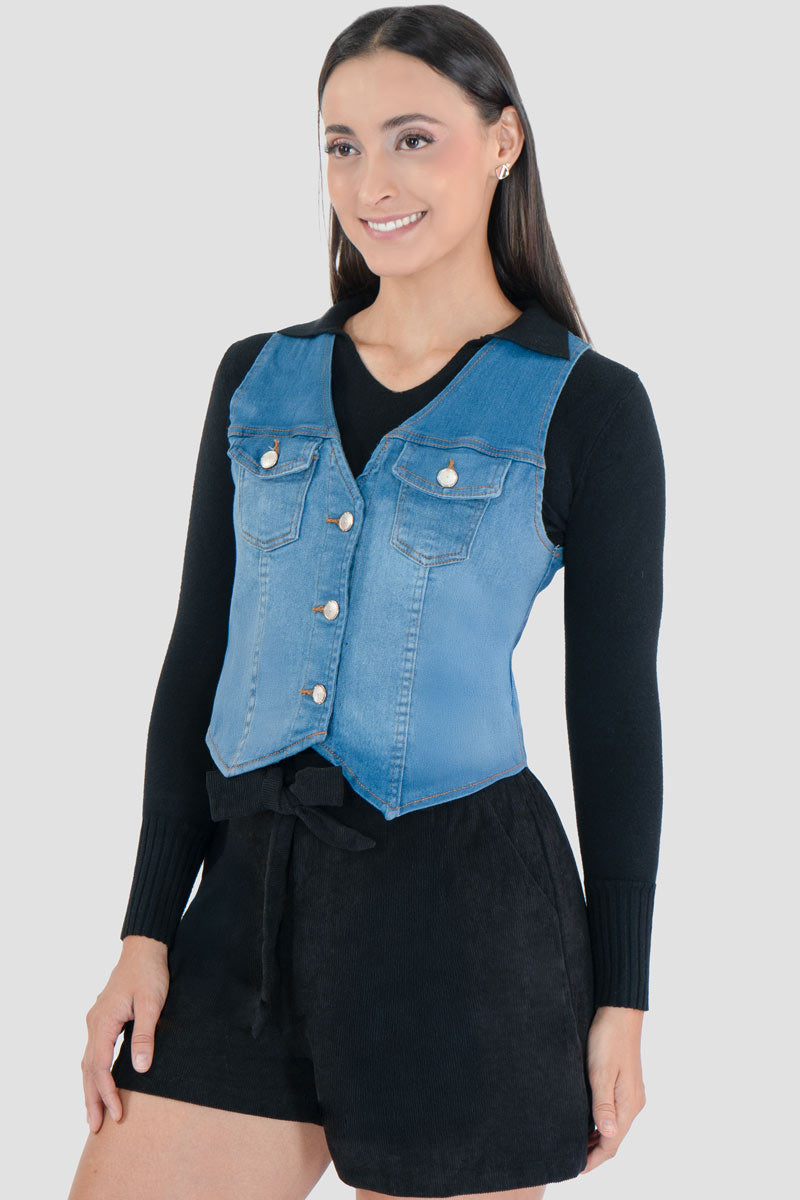 El chaleco corto de mezclilla azul es una prenda juvenil y en tendencia que complementa cualquier look casual. Su diseño entallado y con botones metálicos lo hace ideal para crear combinaciones modernas con jeans, shorts o faldas. Perfecto para outfits relajados o urbanos, este chaleco es una prenda versátil que aporta estilo y frescura a tu guardarropa