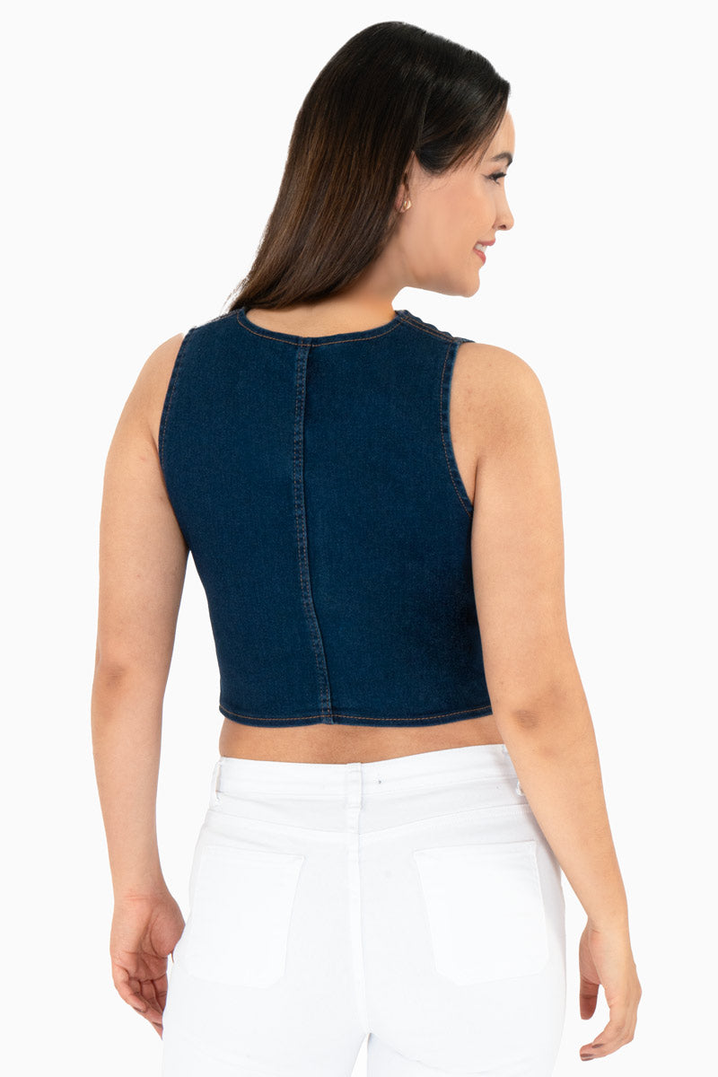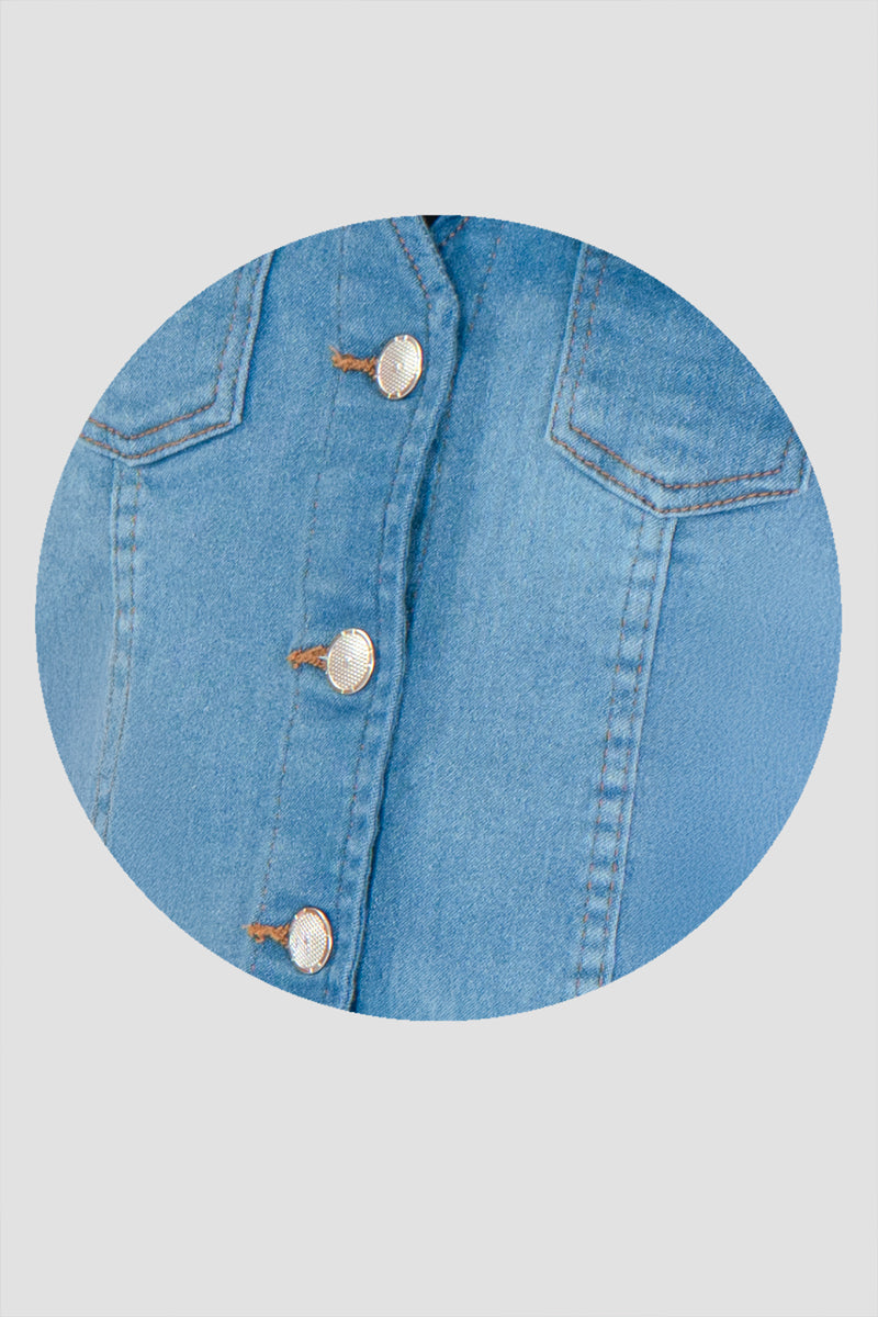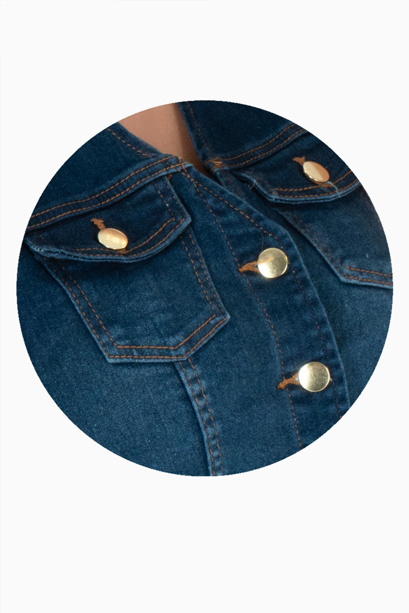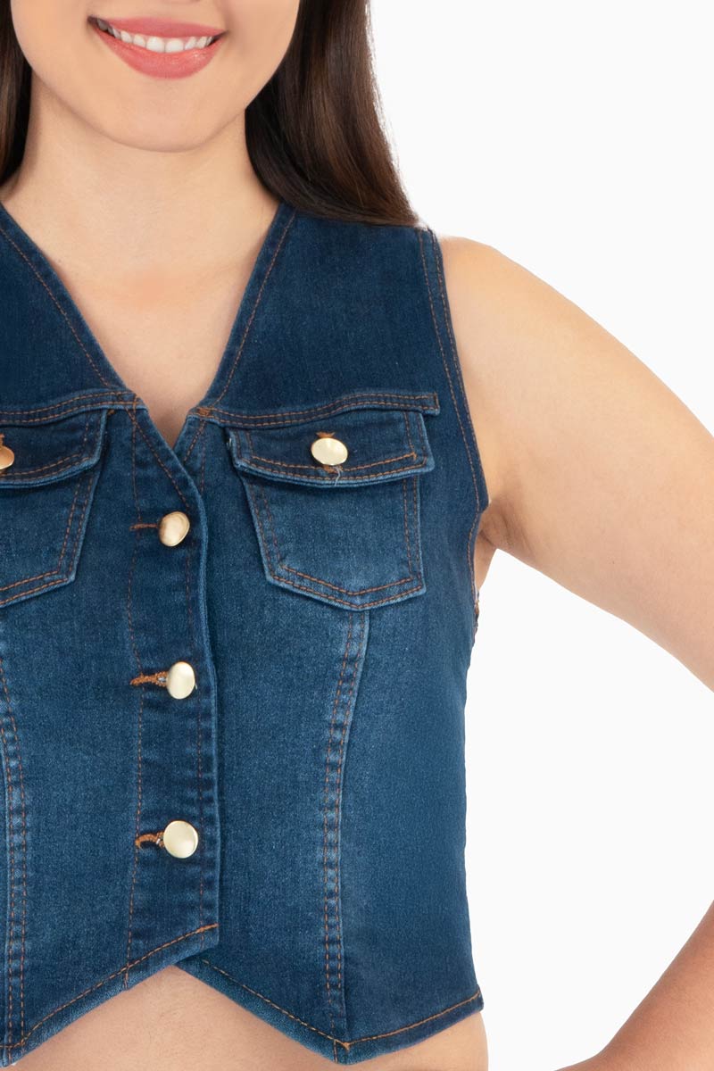 El chaleco corto de mezclilla azul es una prenda juvenil y en tendencia que complementa cualquier look casual. Su diseño entallado y con botones metálicos lo hace ideal para crear combinaciones modernas con jeans, shorts o faldas. Perfecto para outfits relajados o urbanos, este chaleco es una prenda versátil que aporta estilo y frescura a tu guardarropa