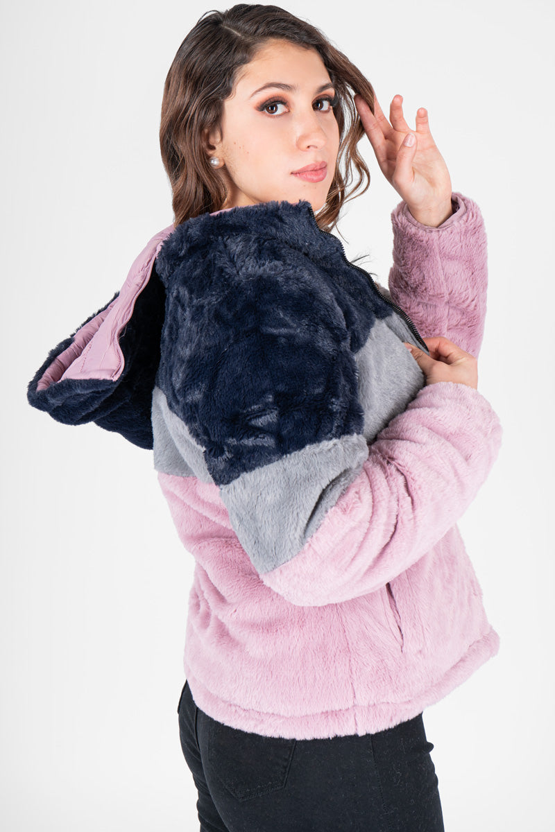 Chamarra capitonada, reversible de peluche y con capucha desmontable.