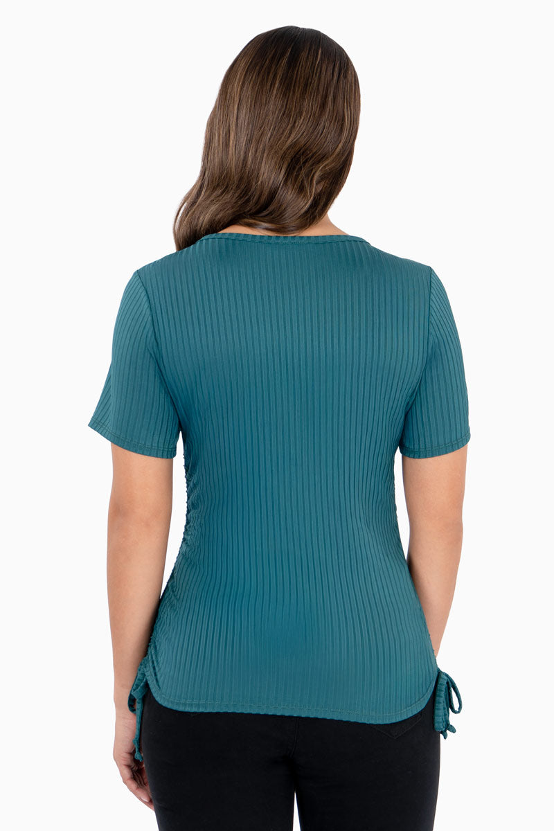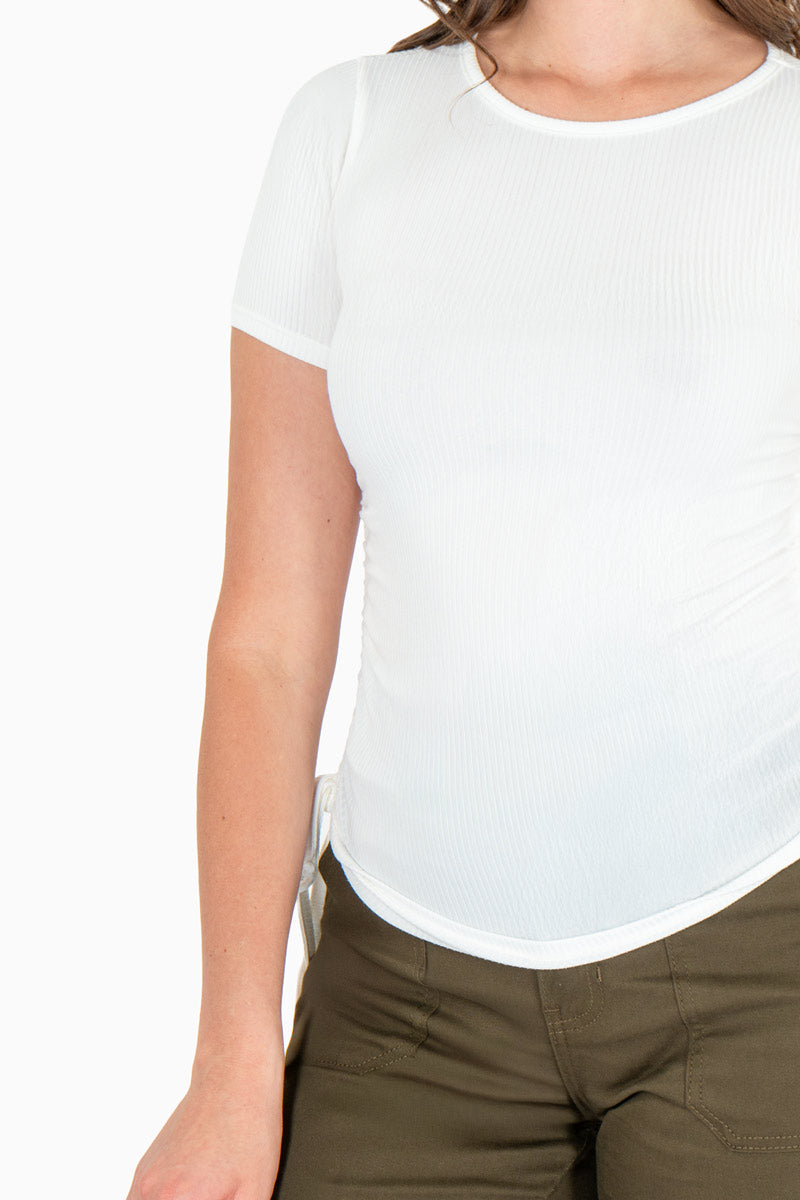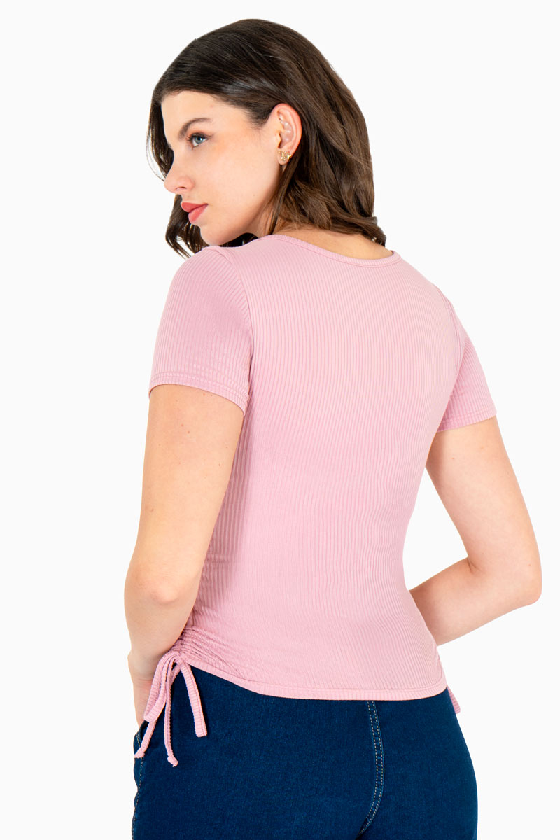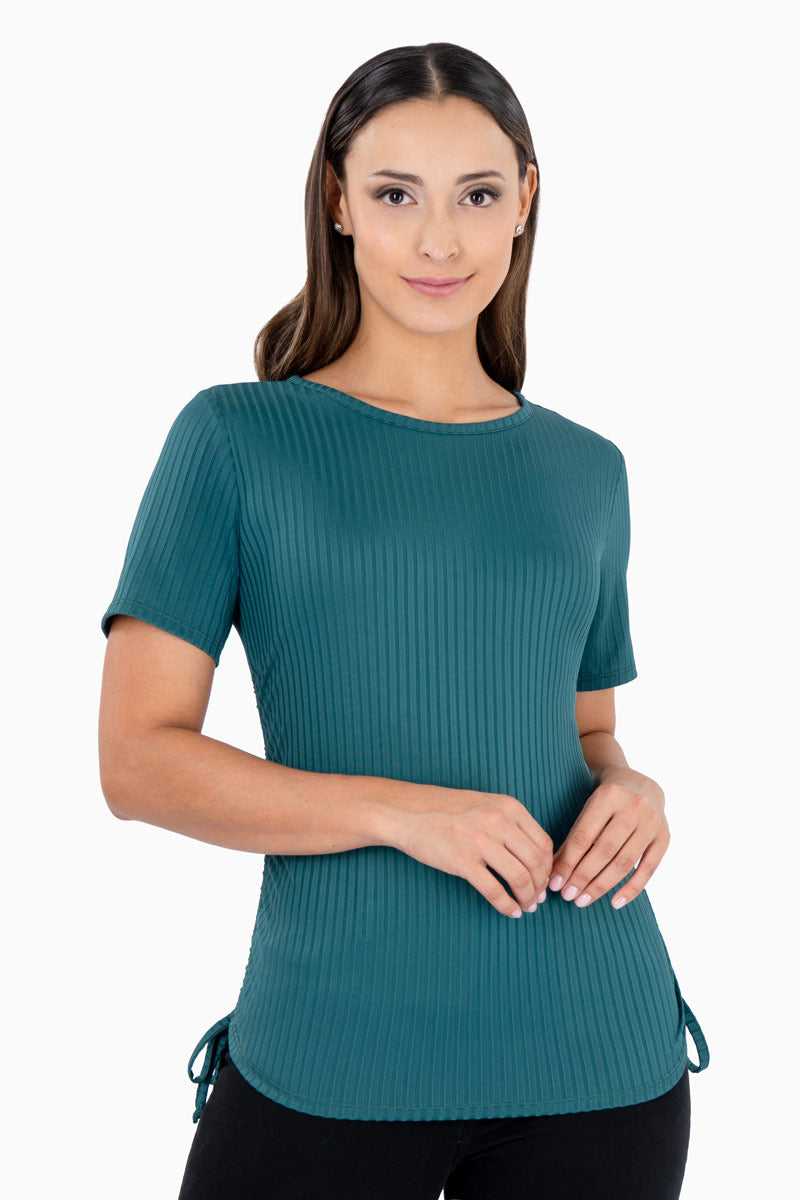 Playera de manga corta presenta un diseño moderno con textura acanalada que realza la figura. Está confeccionada en un tejido suave, elástico y ligero, ideal para mantener la comodidad durante todo el día. Su detalle de fruncido lateral ajustable le da un toque único y femenino, permitiéndote personalizar el largo según tu estilo.