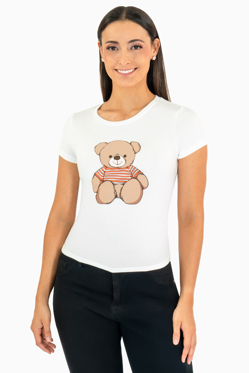 Esta playera de manga corta presenta un encantador oso ilustrado en el centro, creando un look divertido y tierno para el día a día. Su corte clásico y el cuello redondo ofrecen comodidad y versatilidad para combinar con jeans, faldas o shorts. Ideal para outfits informales, accesorios simples y un toque lúdico en cualquier estación. Prenda esencial de fácil cuidado y gran durabilidad.