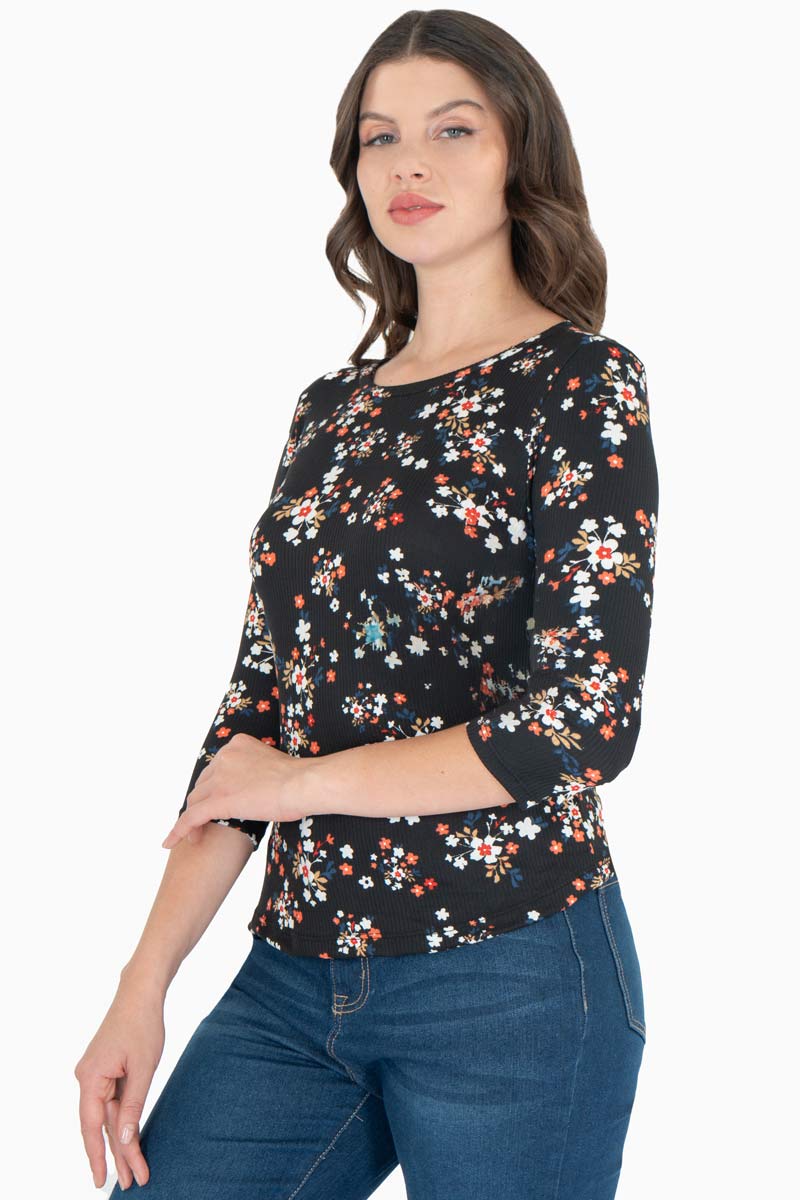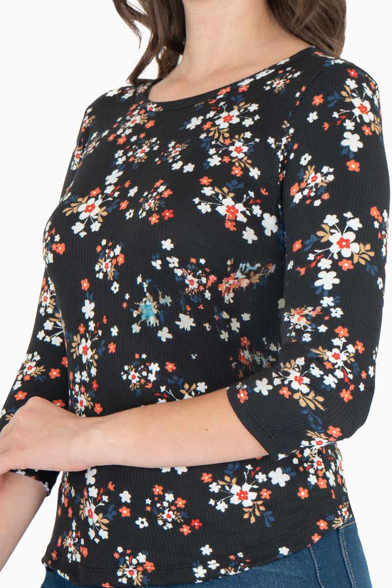 Luce un estilo fresco y femenino con esta blusa negra de flores con manga 3/4. Perfecta para primavera y otoño, su estampado floral aporta alegría y color a tu look. Combínala con jeans o faldas para un outfit casual con mucho estilo. Ideal para oficina, salidas informales o una tarde con amigas.