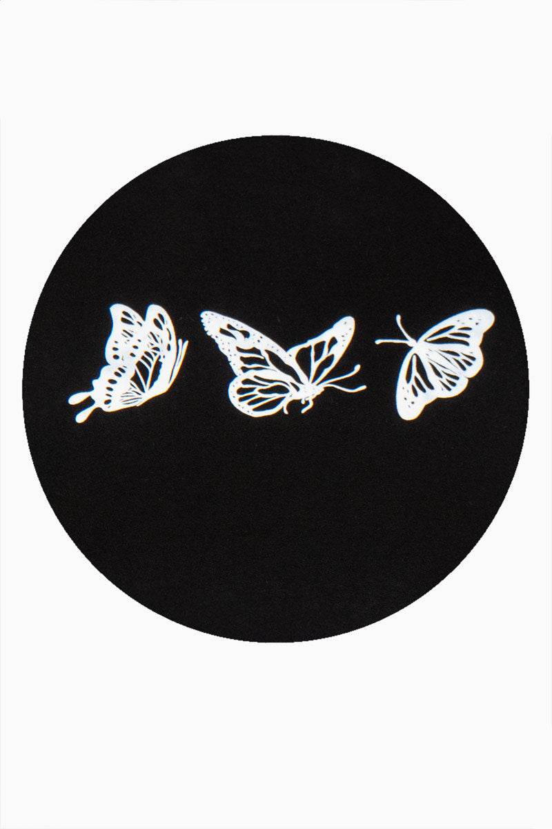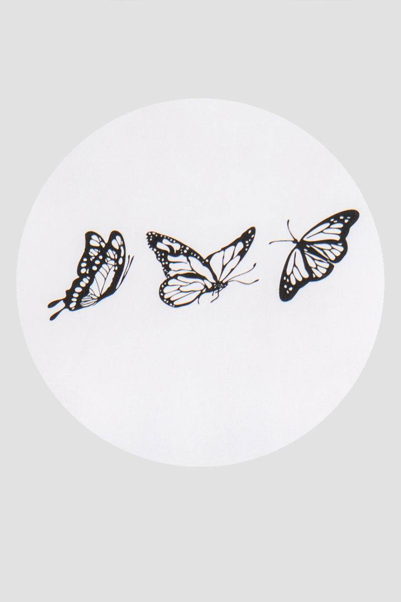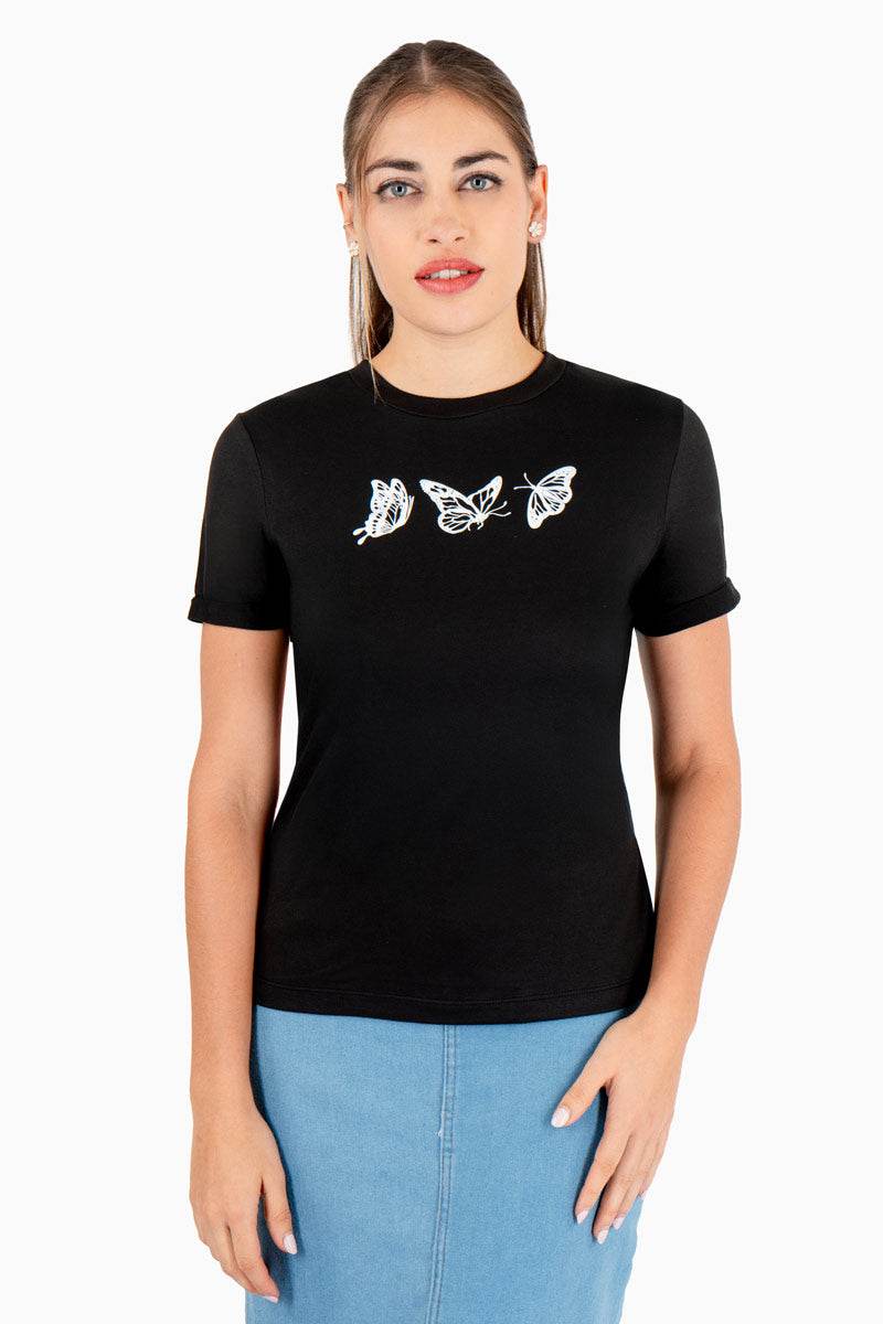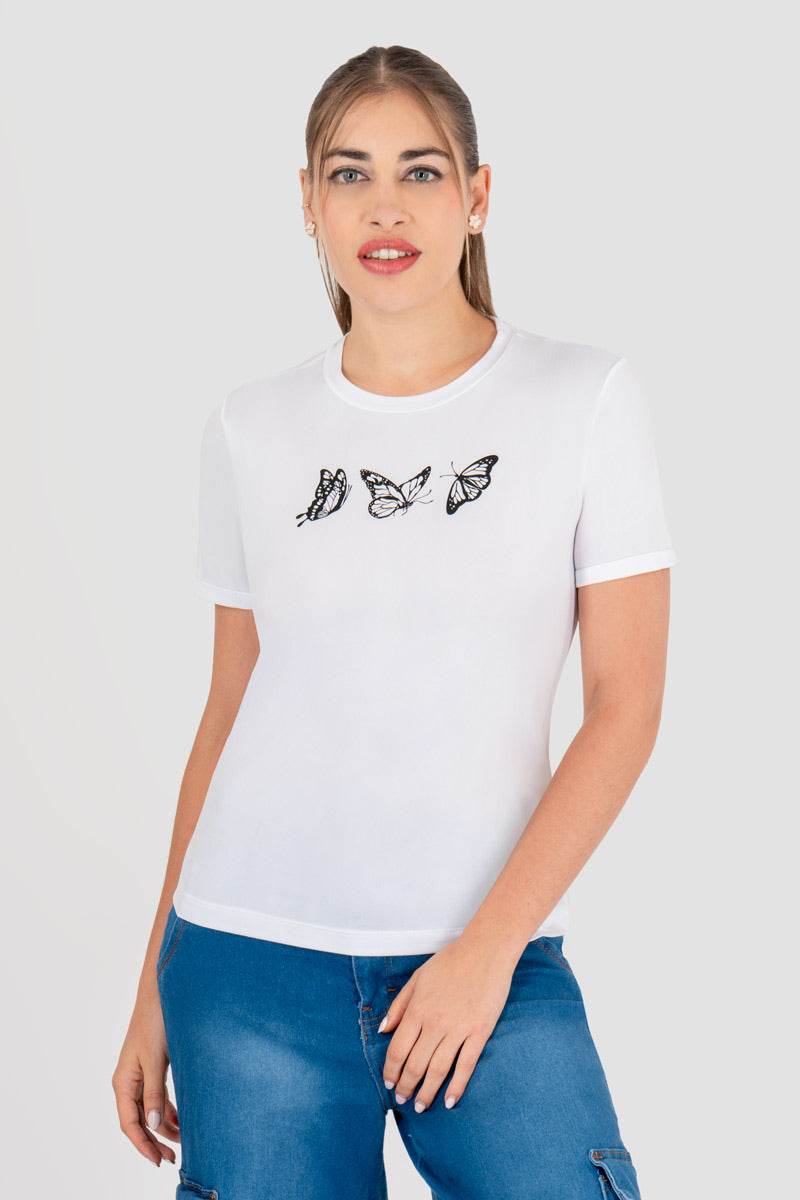 Playera manga corta escote redondo con estampado de mariposas.