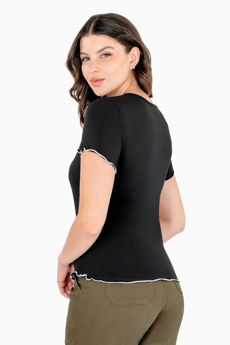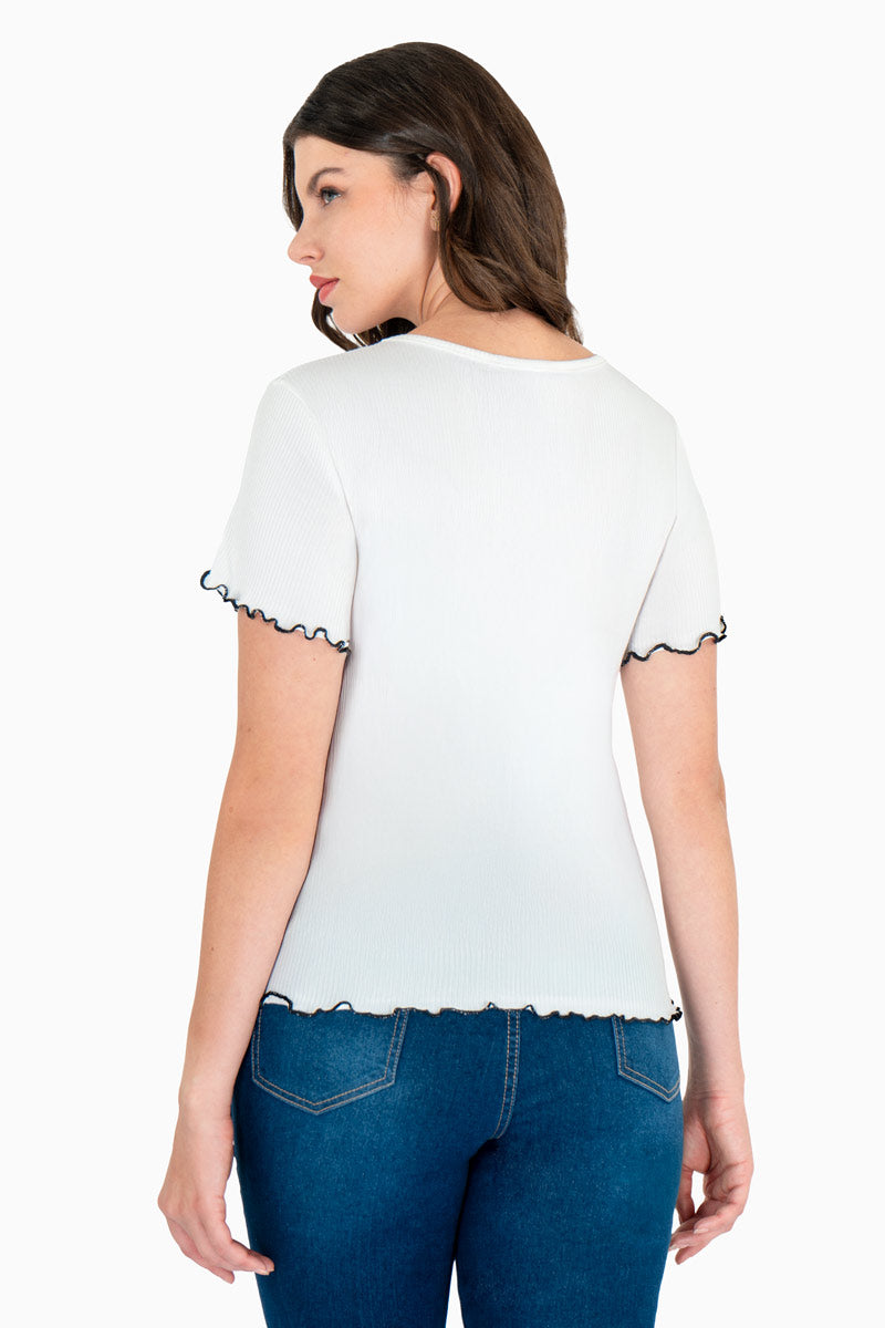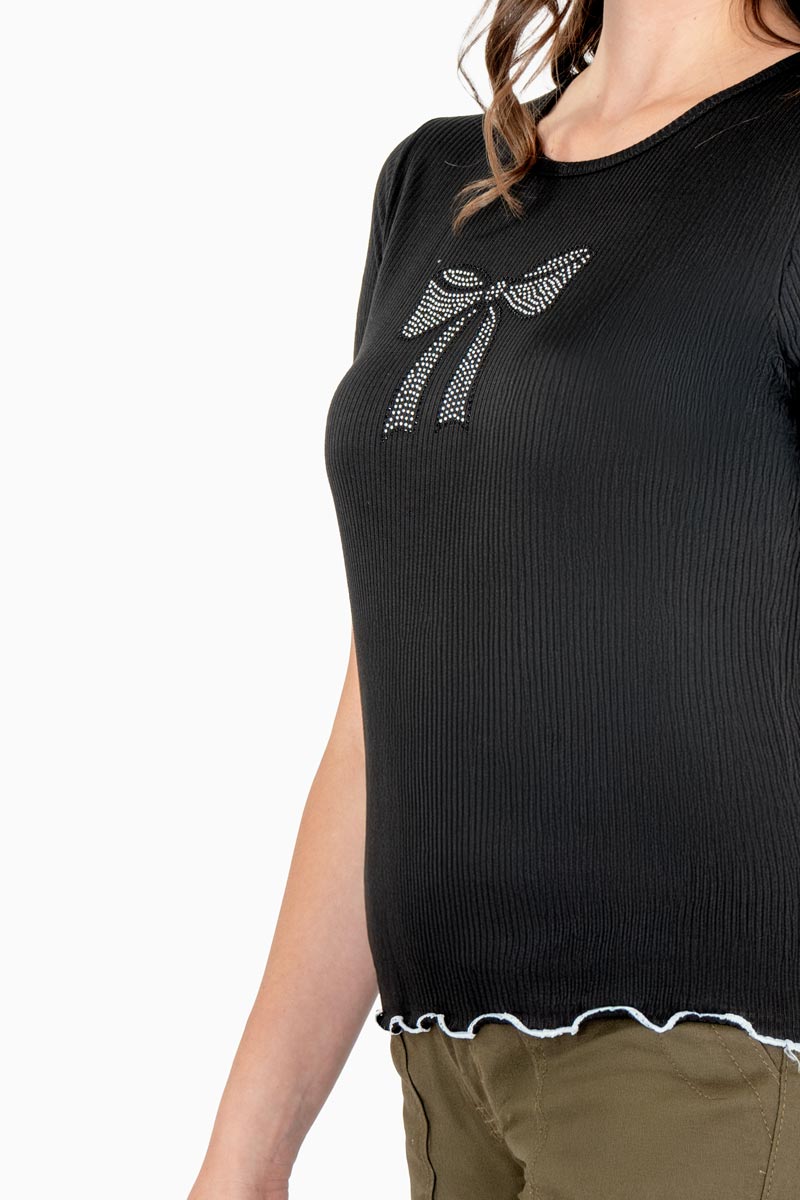 Dale un giro elegante a tus básicos con esta playera con moño decorativo en pedrería brillante. Su corte entallado y tela acanalada resaltan tu silueta, mientras que el moño en el pecho añade un toque sofisticado y delicado. Ideal para combinar con jeans, faldas o pantalones formales. Una opción versátil para un look casual chic.