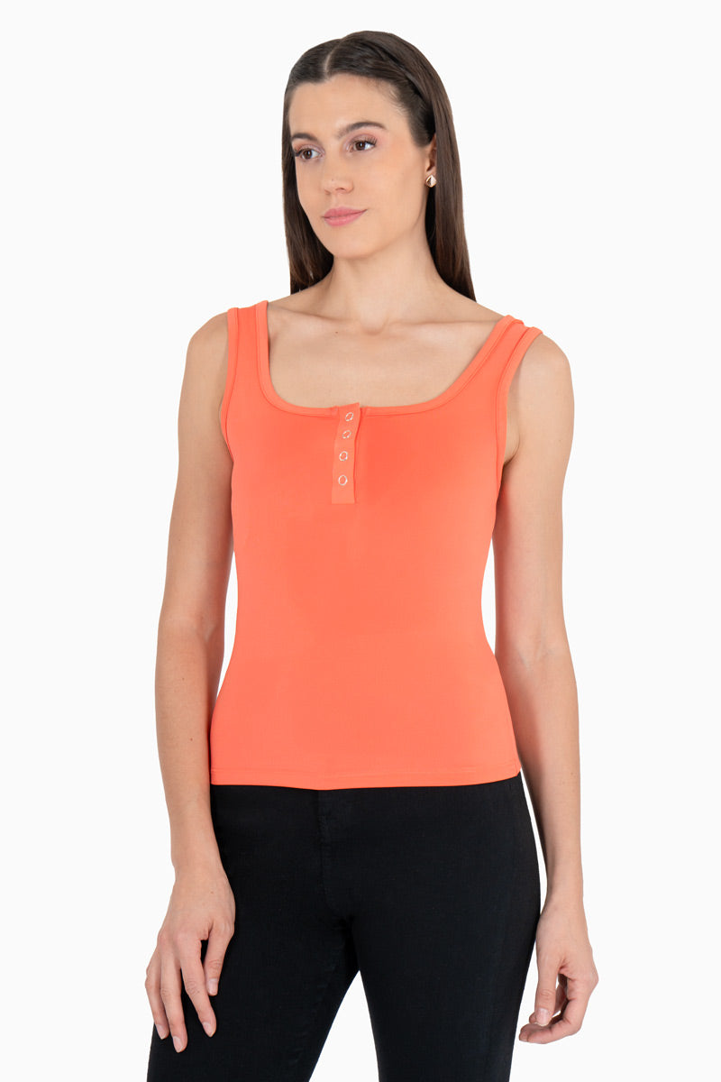 Esta playera sin mangas en tono naranja coral es perfecto para los días cálidos. Su diseño con tirantes anchos y escote cuadrado brinda soporte y estilo. Incluye un detalle de botones decorativos en la parte frontal que aporta un aire casual y femenino. La tela elástica se adapta cómodamente al cuerpo, destacando tu silueta.