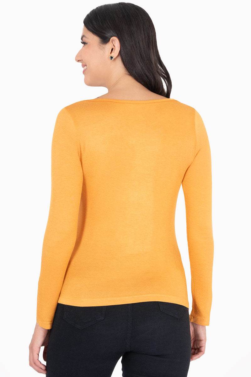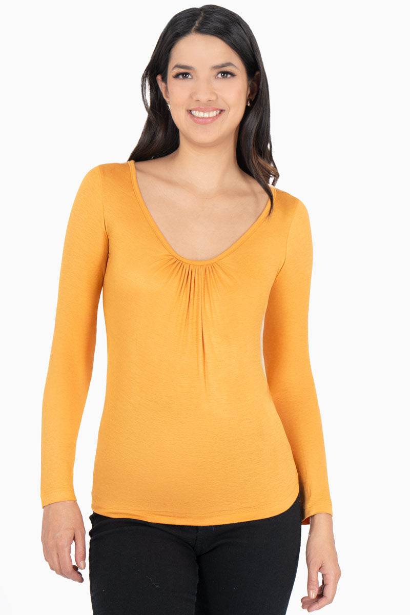 Playera lisa, manga larga y cuello redondo con plisado en escote.