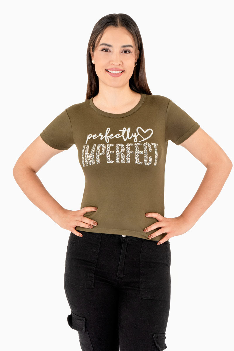 Playera con mensaje Perfectly Imperfect, manga corta y cuello redondo.