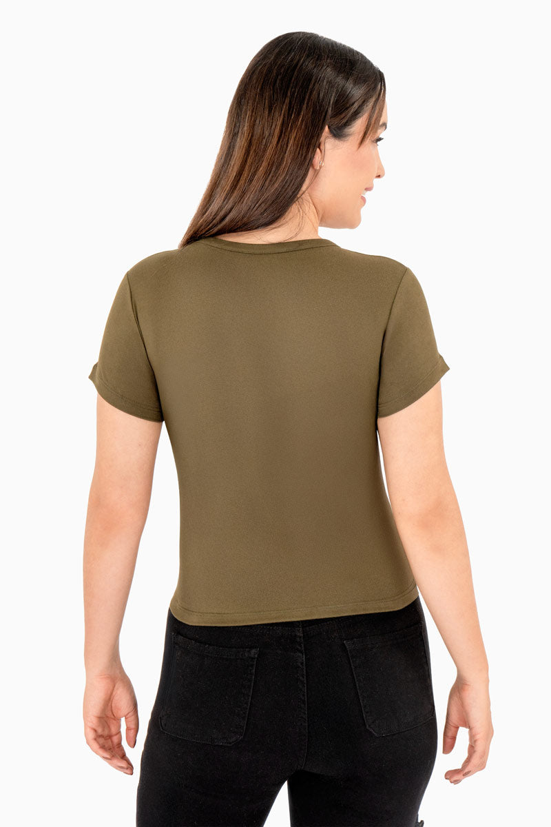 Expresa tu autenticidad con esta camiseta verde olivo de manga corta, que destaca por su estampado frontal con mensaje en letras decorativas y un pequeño corazón. Su tejido suave y elástico ofrece máxima comodidad, mientras que su corte ajustado realza la silueta. Perfecta para looks relajados de fin de semana o para agregar un toque personal a tu outfit diario. Llévala con jeans, joggers o incluso debajo de una chaqueta para un estilo desenfadado pero con actitud.