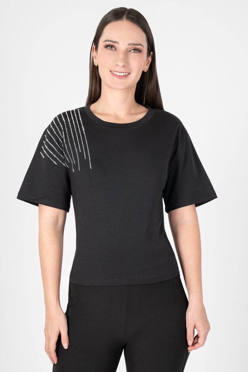 Playera manga corta escote red con piedras.
