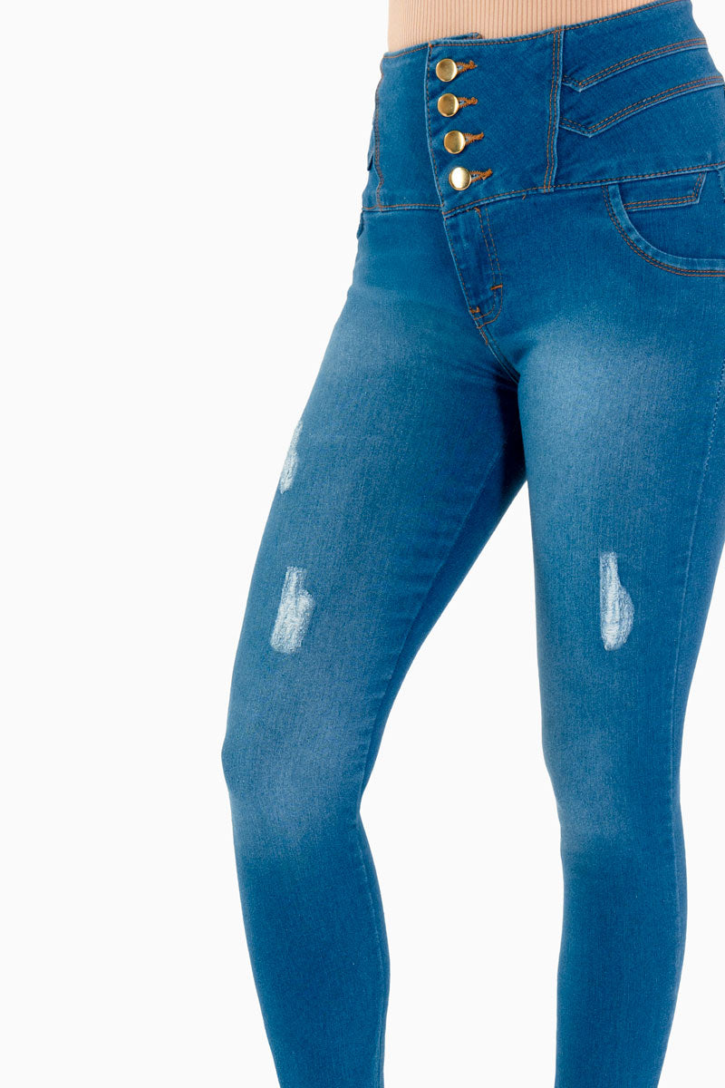 Luce una silueta estilizada con estos jeans skinny para dama de tiro medio, diseñados para ofrecer comodidad y un ajuste favorecedor durante todo el día. Su fajilla ancha con cuatro botones metálicos aporta un toque moderno y ayuda a definir la cintura de forma natural. Los desgastes estratégicos añade un estilo juvenil y actual. Perfectos para combinar con blusas, camisetas o suéteres y crear looks casuales, urbanos o para la oficina. Una prenda básica y versátil para tu guardarropa.