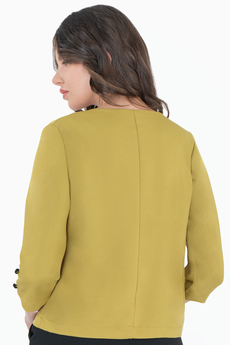 Este saco corto es la pieza perfecta para elevar cualquier look con un toque de color y sofisticación. Diseñado con mangas 3/4 y botones decorativos, ofrece un corte moderno y estructurado que se ajusta a la silueta sin restringir el movimiento. Su diseño abierto sin cierre lo hace ideal para llevar sobre vestidos, blusas o tops.