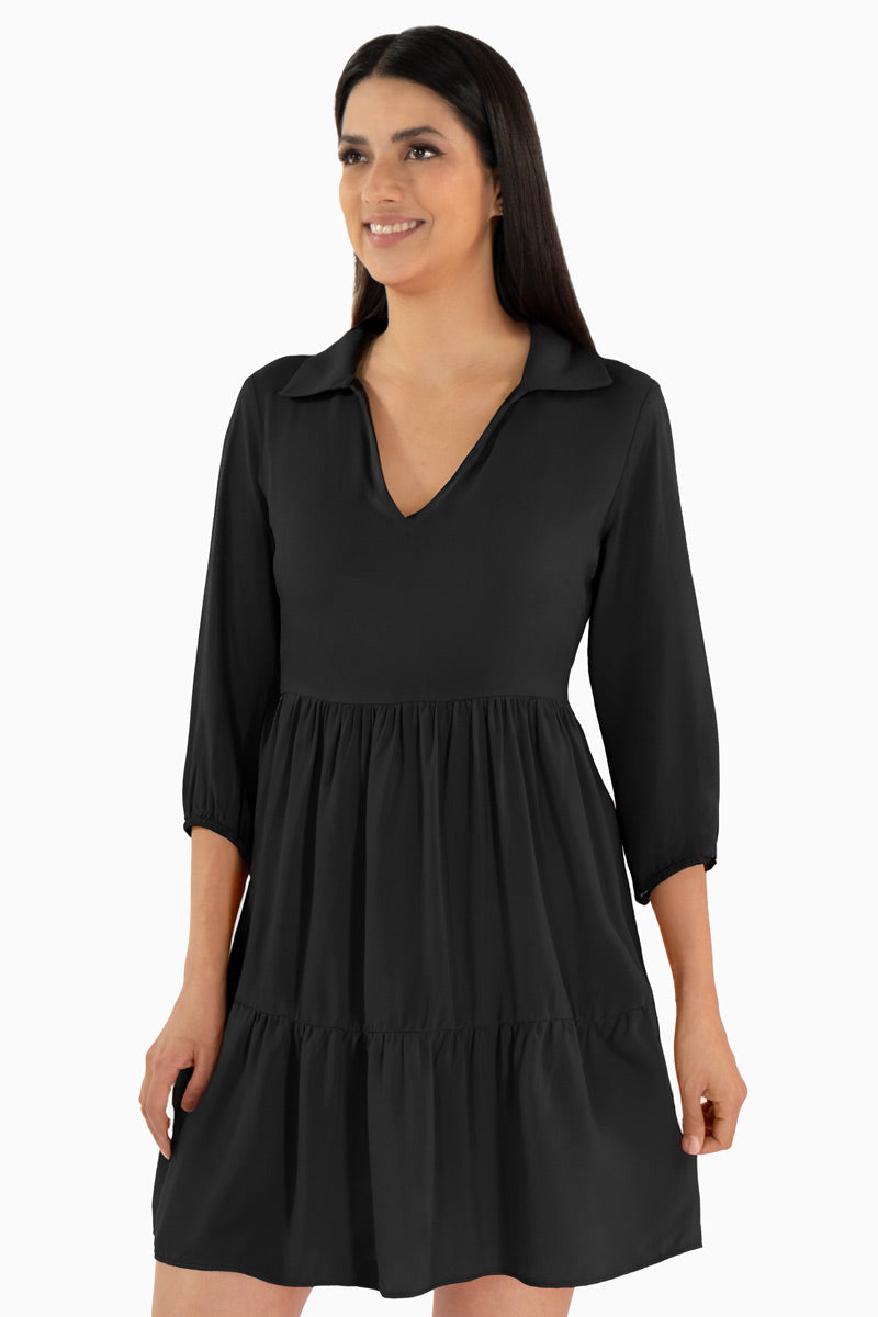 Este vestido corto para mujer con cuello camisero es ideal para lograr un look femenino, cómodo y moderno. Su diseño de manga 3/4 y falda con caída ligera aporta movimiento y frescura, mientras que el escote en V estiliza la figura de forma natural. Perfecto para uso diario, trabajo o salidas casuales, es una prenda versátil que se adapta fácilmente a distintos estilos y ocasiones.
