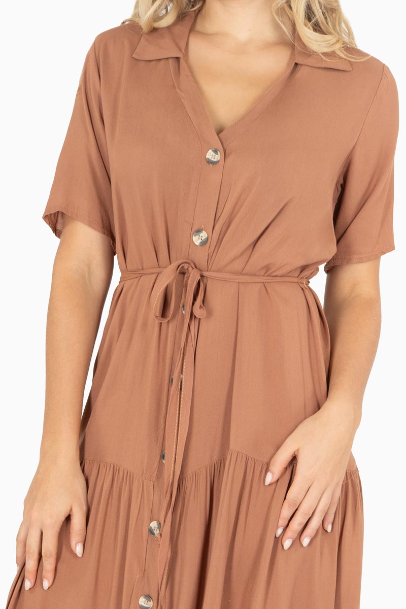 Explora la elegancia atemporal con este  maxi vestido con botones frontales. Su escote en V y la cintura ajustable realzan la figura, mientras la falda caída suave ofrece movimiento y comodidad durante todo el día. Ideal para eventos formales, cenas o looks de oficina con un toque sofisticado. Combínalo con tacones y accesorios minimalistas para un outfit pulido, o con una chaqueta casual para un look diario con estilo.