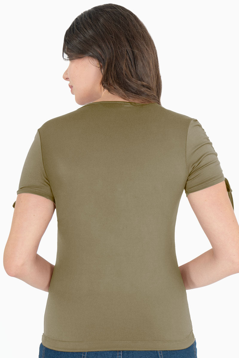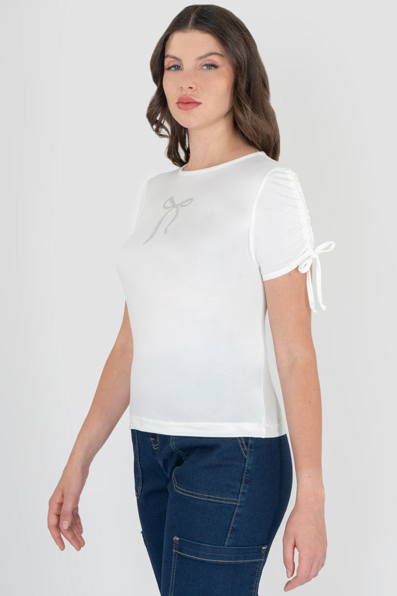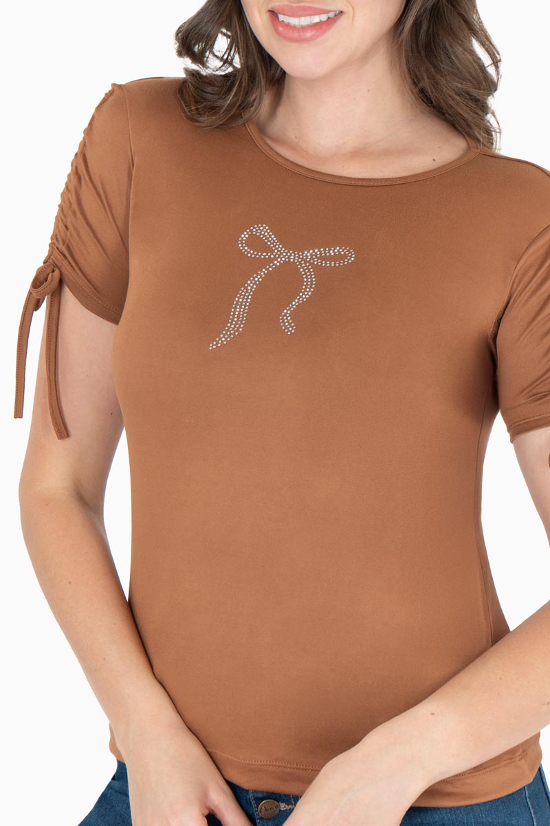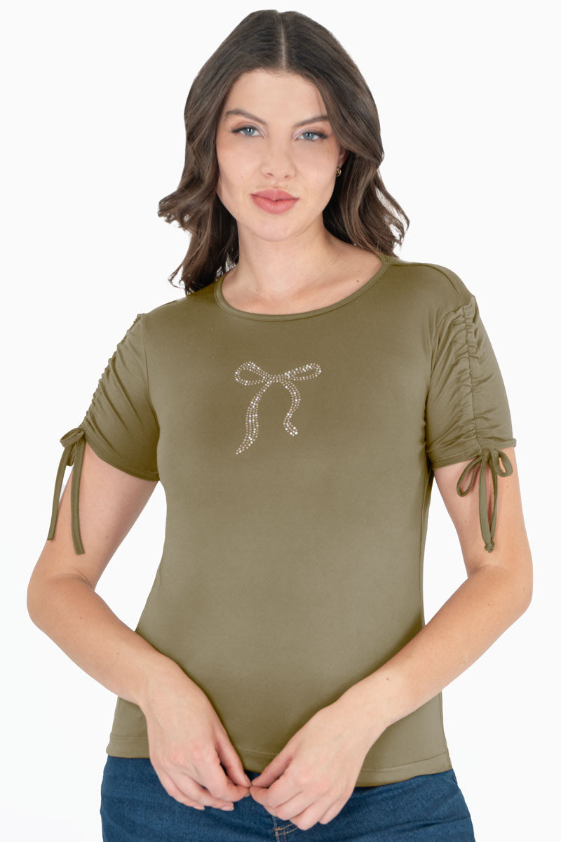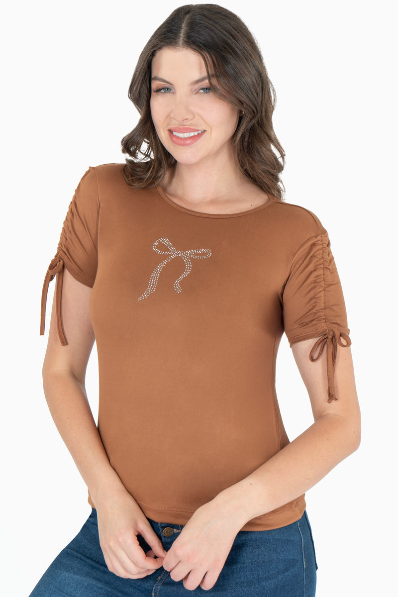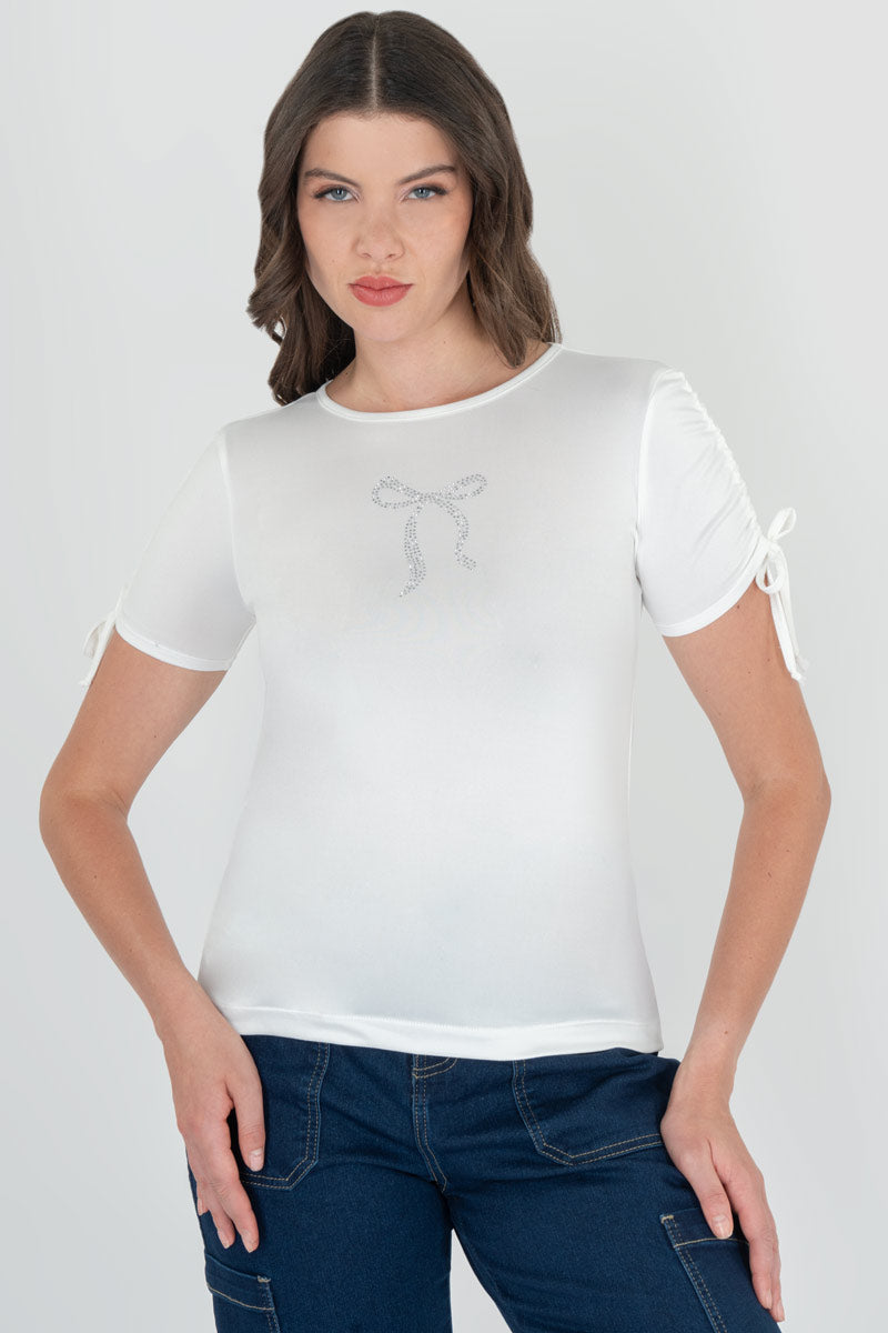 Esta playera con moño de brillantes y mangas fruncidas es perfecta para quienes buscan un toque romántico y chic. Su diseño versátil permite llevarla tanto de día como de noche. Combínala con jeans o faldas para un look femenino y actual.