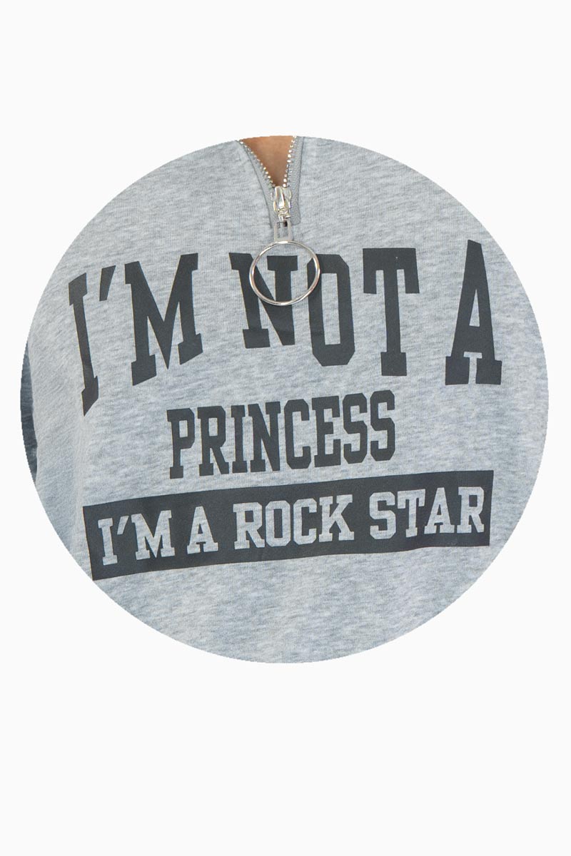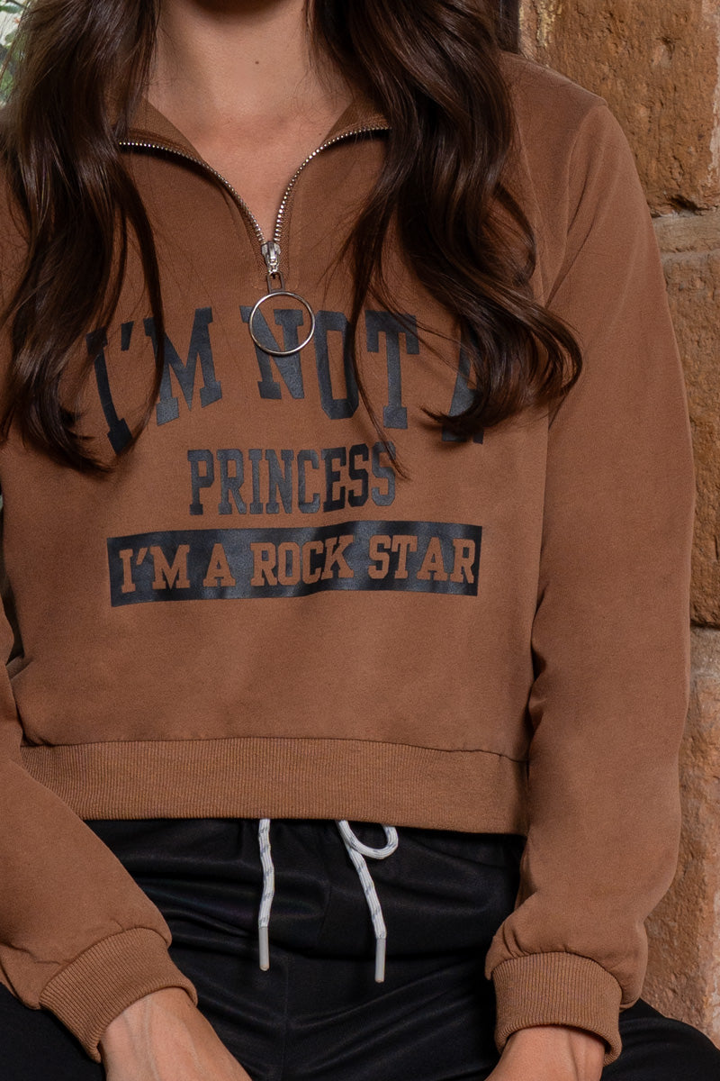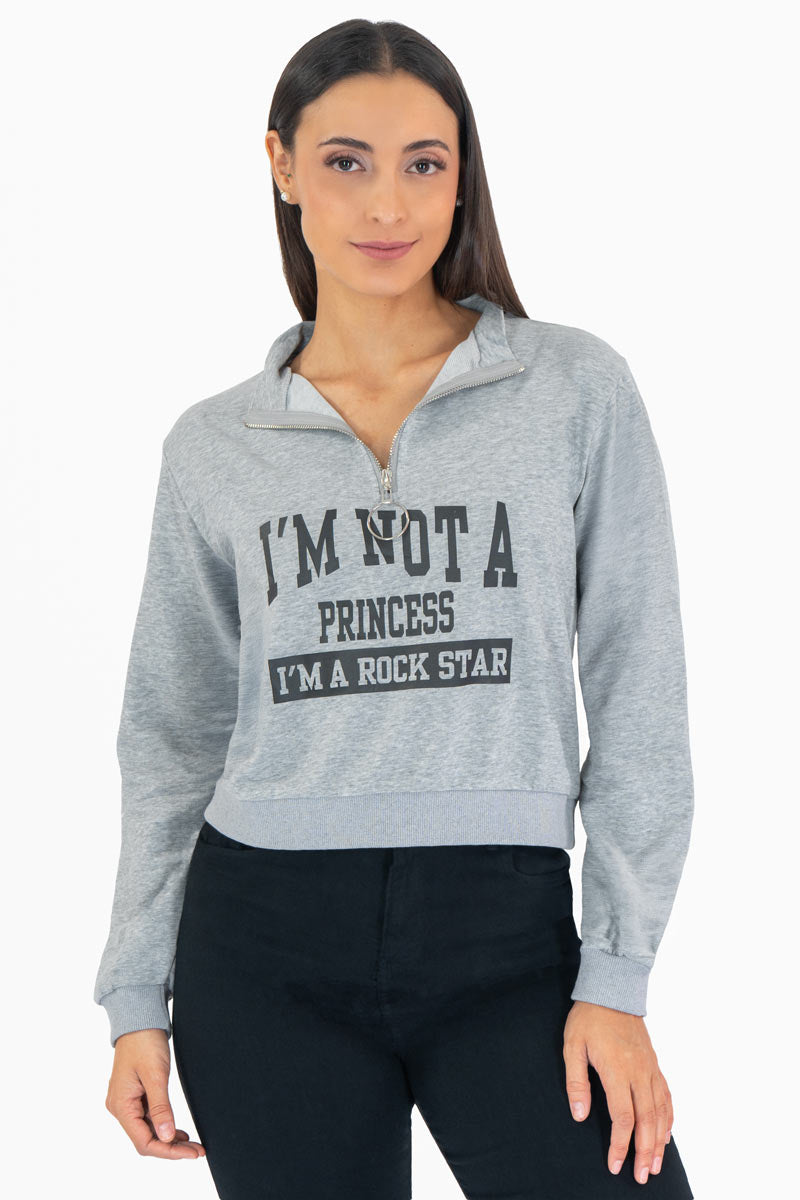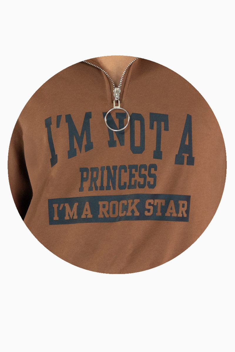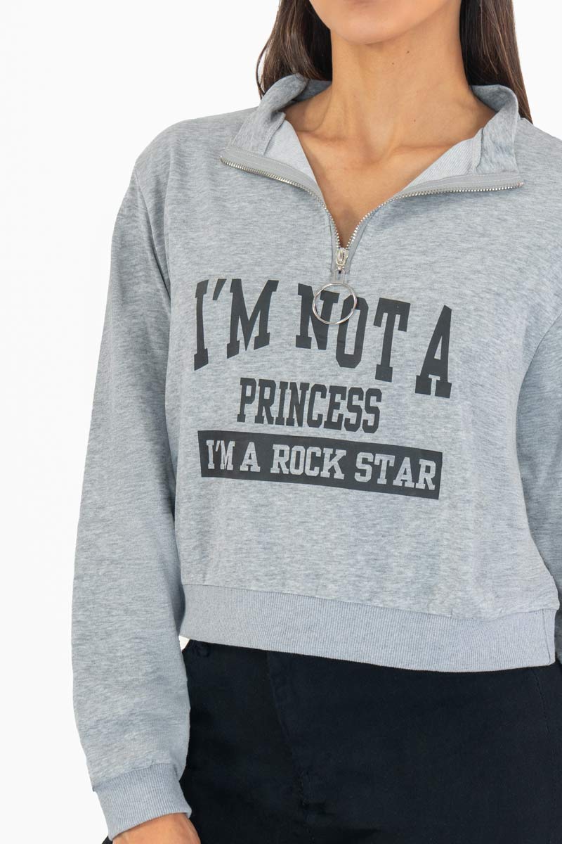 Haz una declaración audaz con esta sudadera para mujer, perfecta para quienes no siguen las reglas. Con un mensaje claro: “I’M NOT A PRINCESS, I’M A ROCK STAR”, esta prenda refleja empoderamiento y actitud. Su diseño incluye un cierre metálico en el cuello estilo medio zipper, ideal para regular el escote según tu estilo.