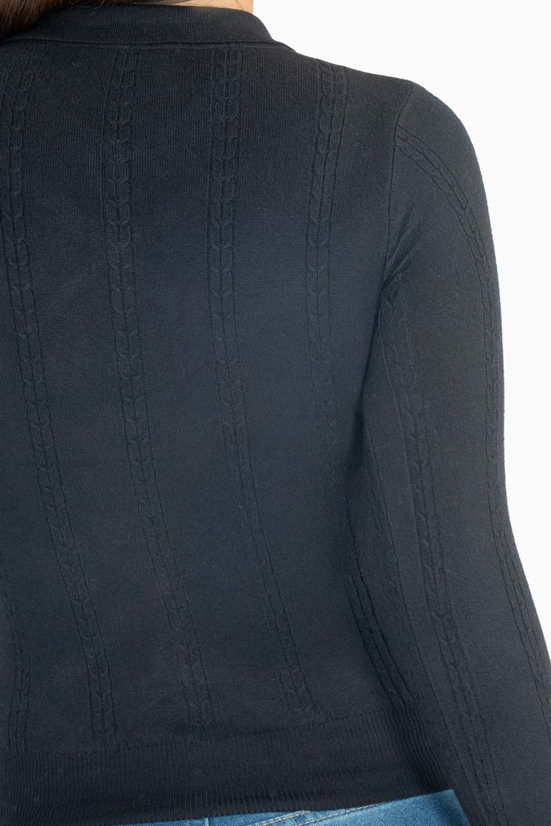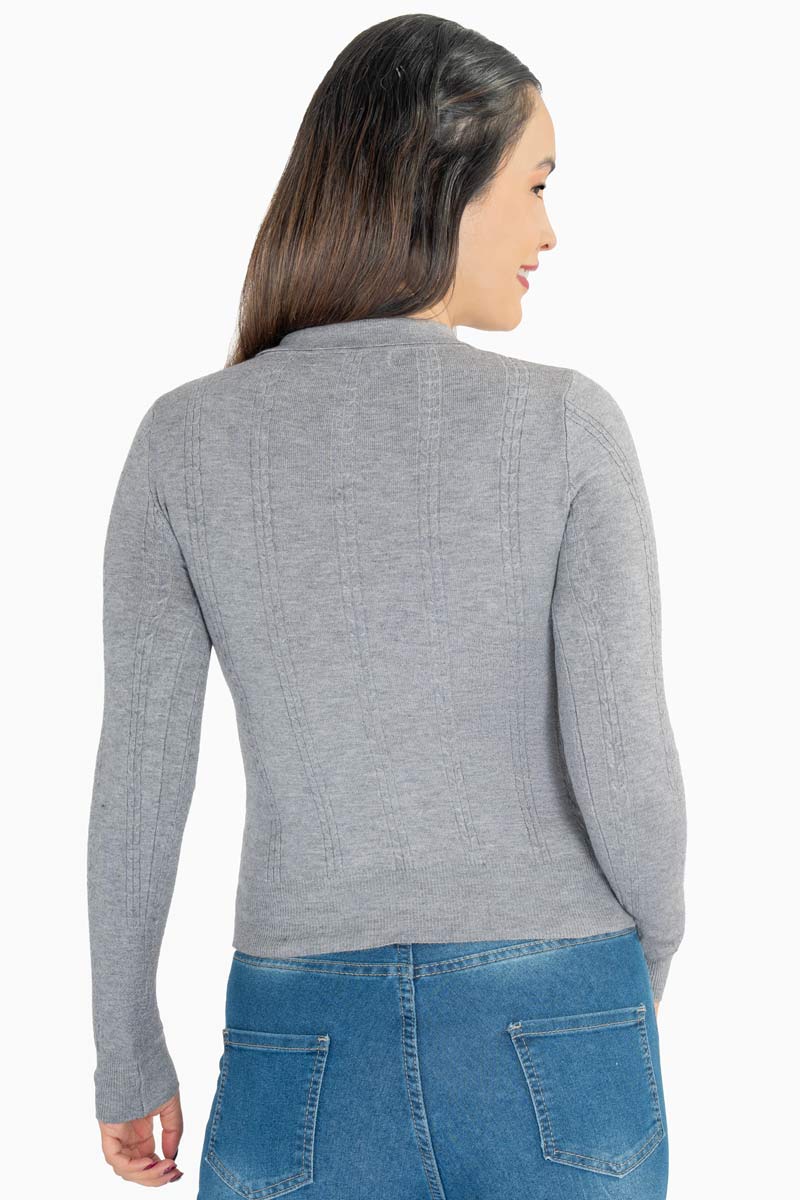 Este suéter de manga larga es un básico infalible para cualquier guardarropa. Su diseño liso con cuello tipo polo aporta un toque casual elegante, ideal para combinar con jeans o pantalones de vestir. Cómoda y fácil de usar, es perfecta para el día a día.