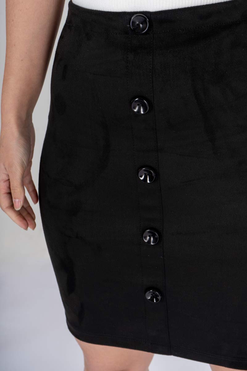 Esta falda negra de gamuza sintética para mujer con botones frontales es la mezcla perfecta entre elegancia y estilo urbano. Su diseño ajustado realza tu figura y añade un toque moderno con su fila de botones decorativos. Ideal para combinar con blusas, tops o suéteres, tanto en eventos casuales como en un día en la oficina. Si buscas una falda corta negra versátil y con estilo, esta es tu opción ideal.
