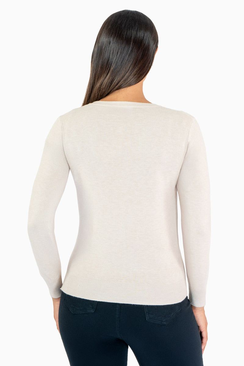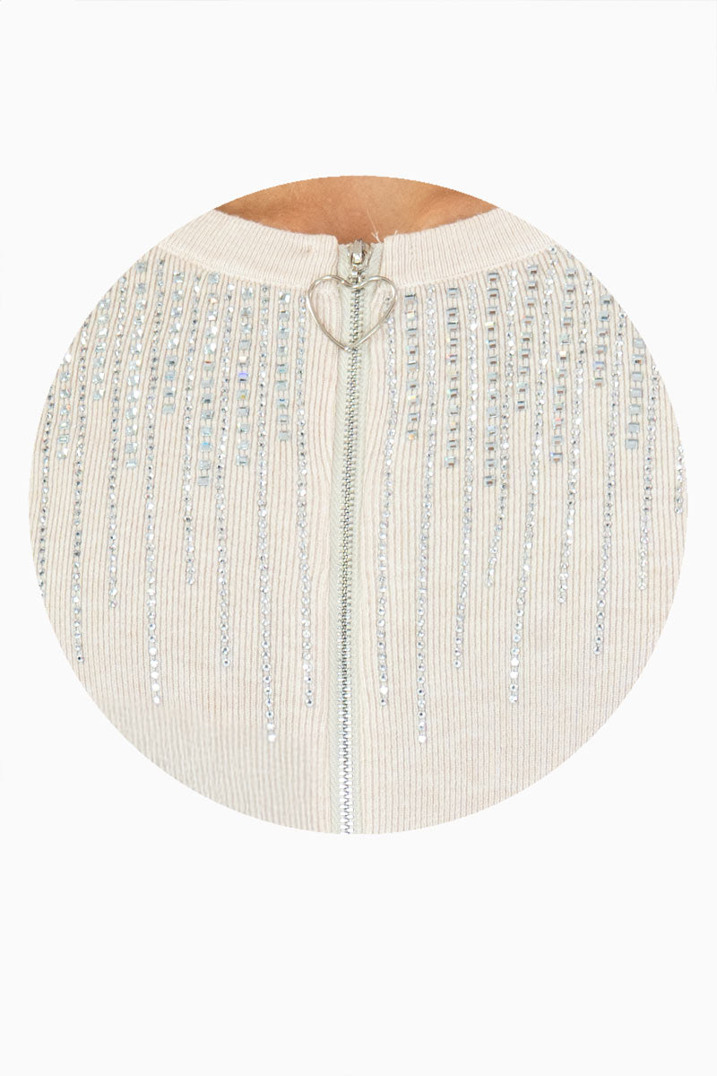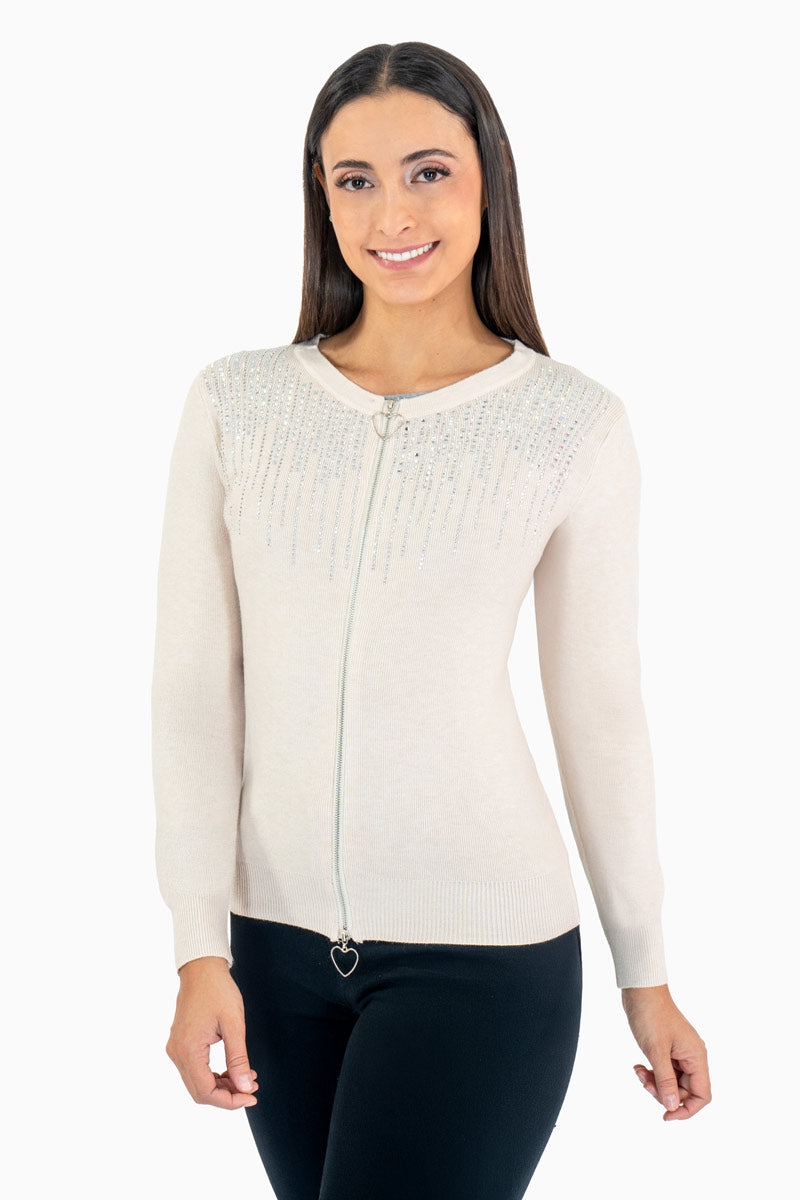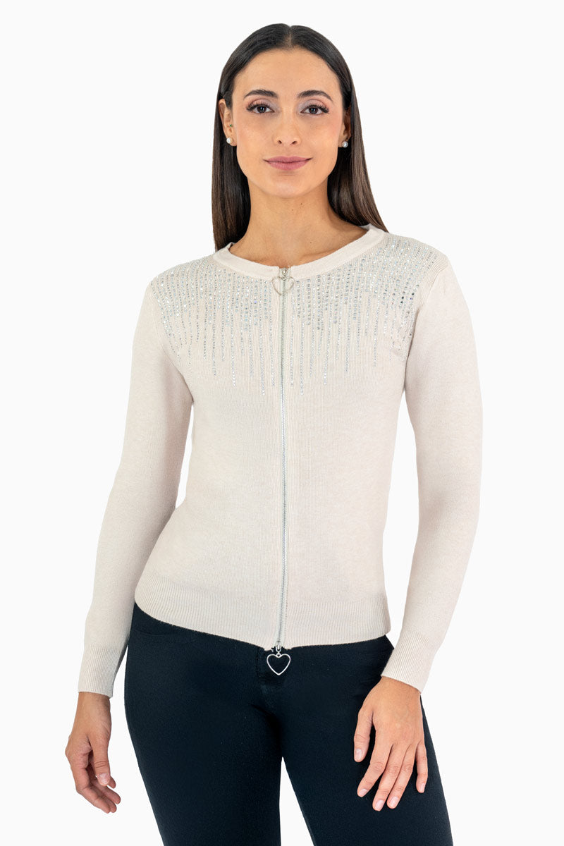 Aporta un toque glamuroso a tu día a día con este suéter con brillos y cierre para mujer. Ideal para destacar en cualquier ocasión, su diseño incorpora detalles brillantes en el pecho y un cierre frontal con tirador decorativo en forma de corazón. Fabricado en un tejido fino y cálido, es perfecto para climas frescos y transiciones de temporada. Combínalo con jeans, faldas o pantalones de vestir para un look elegante, femenino y actual.