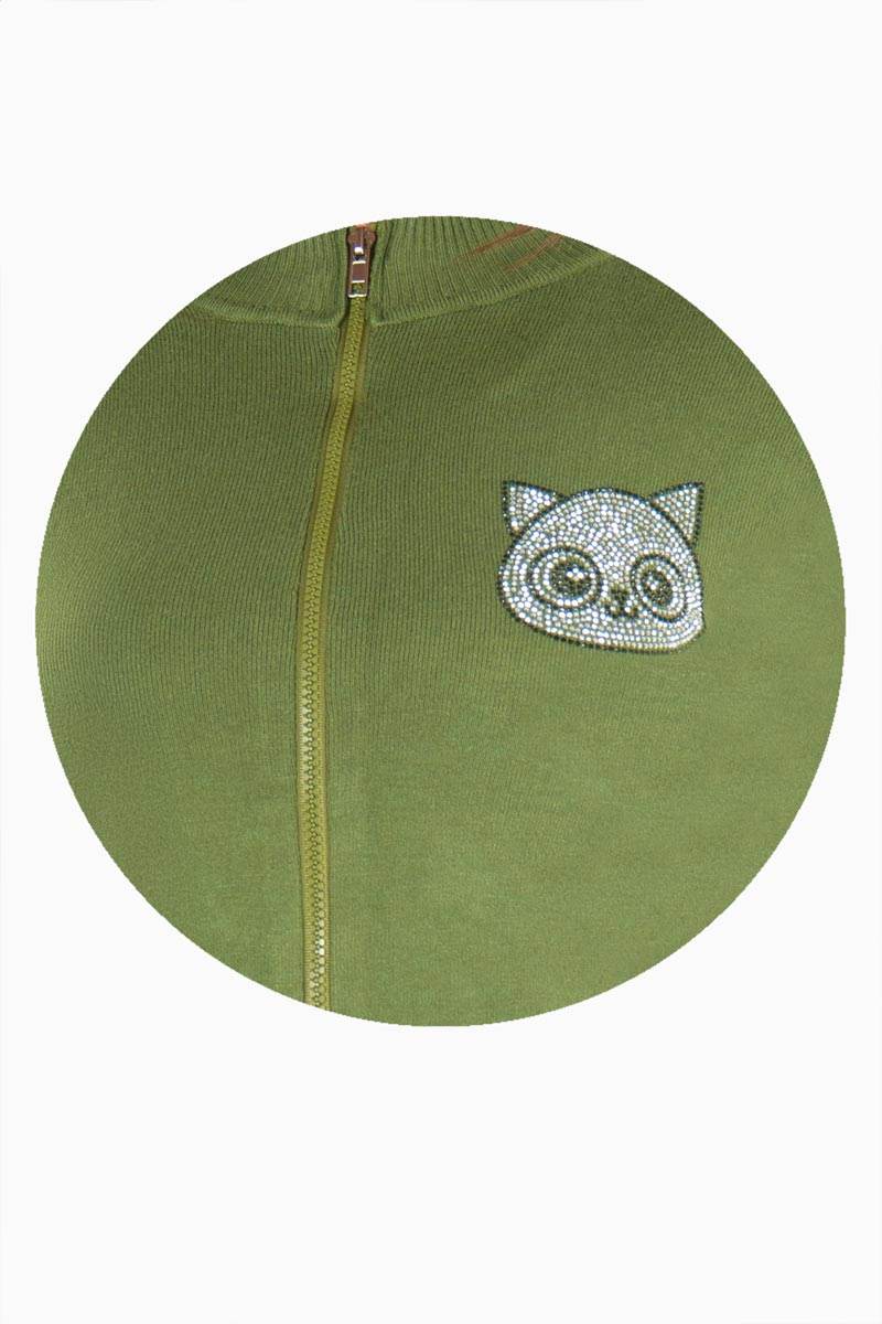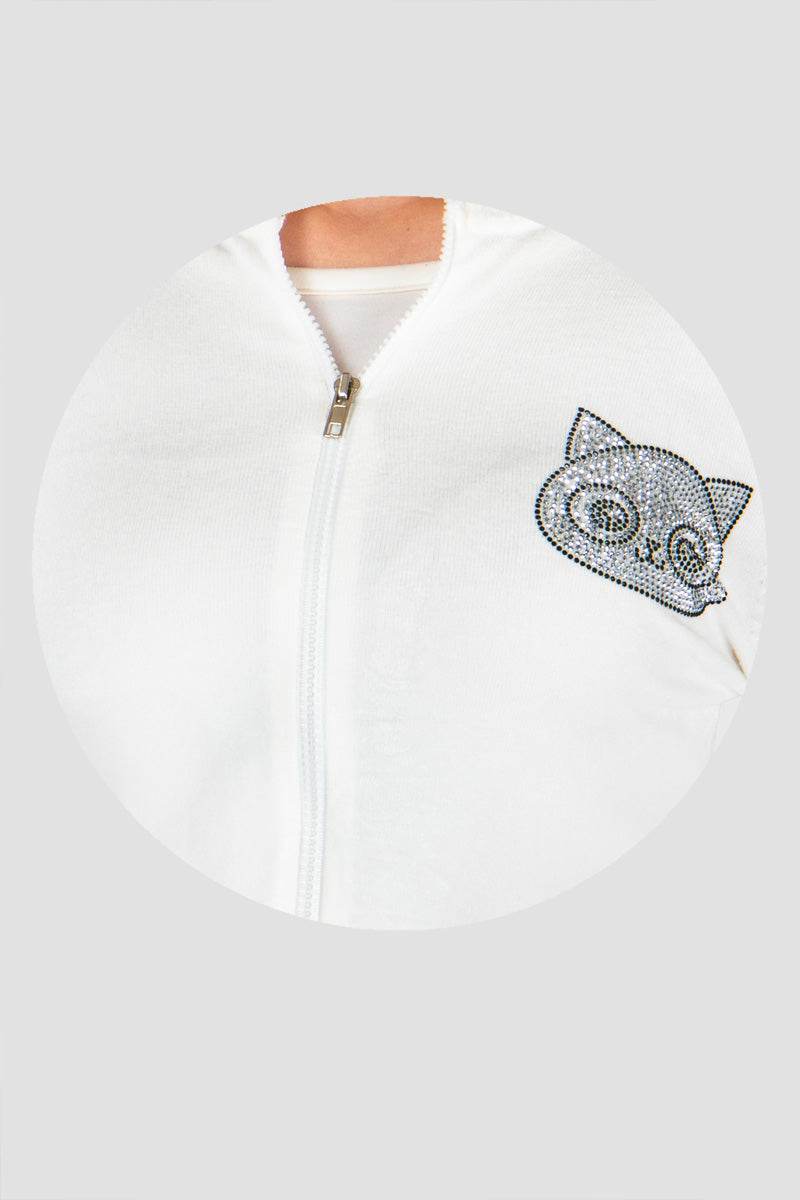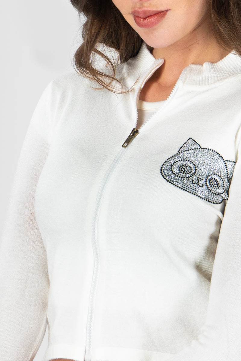 Suéter estampado con cierre y aplicación de piedra.