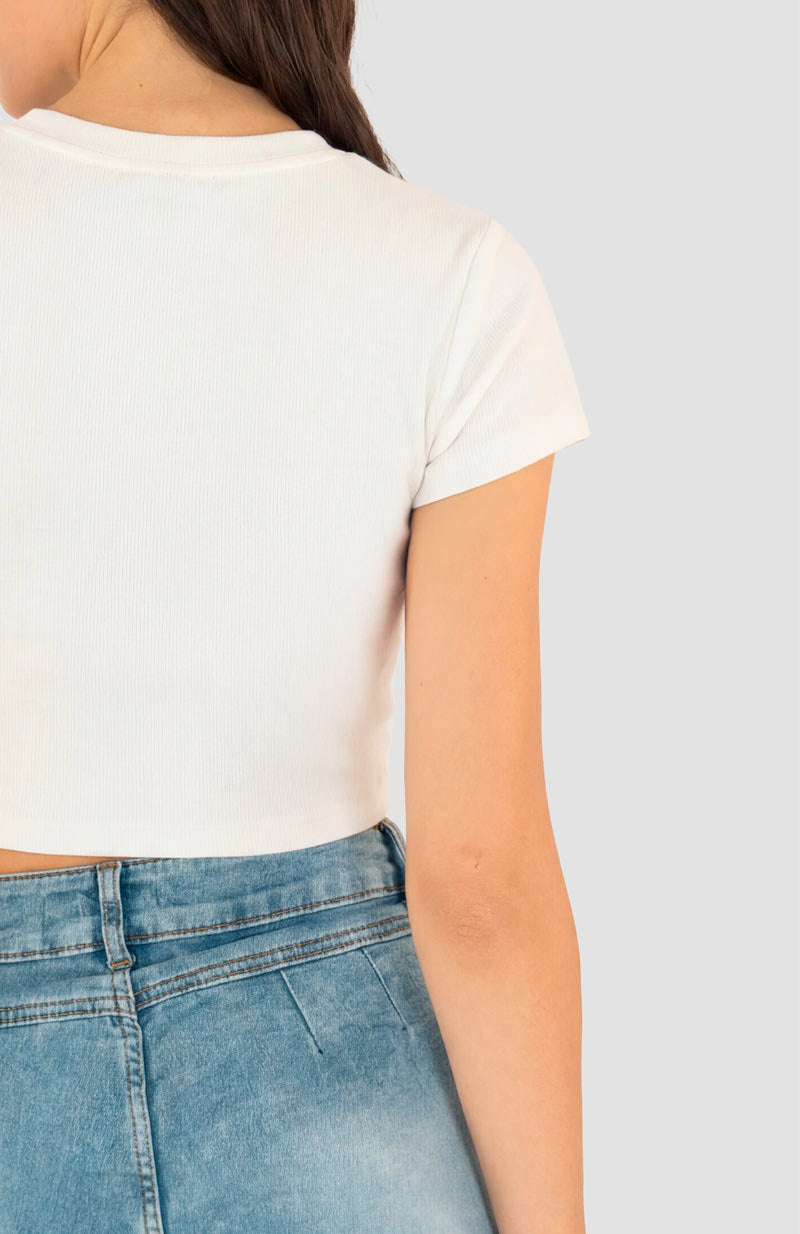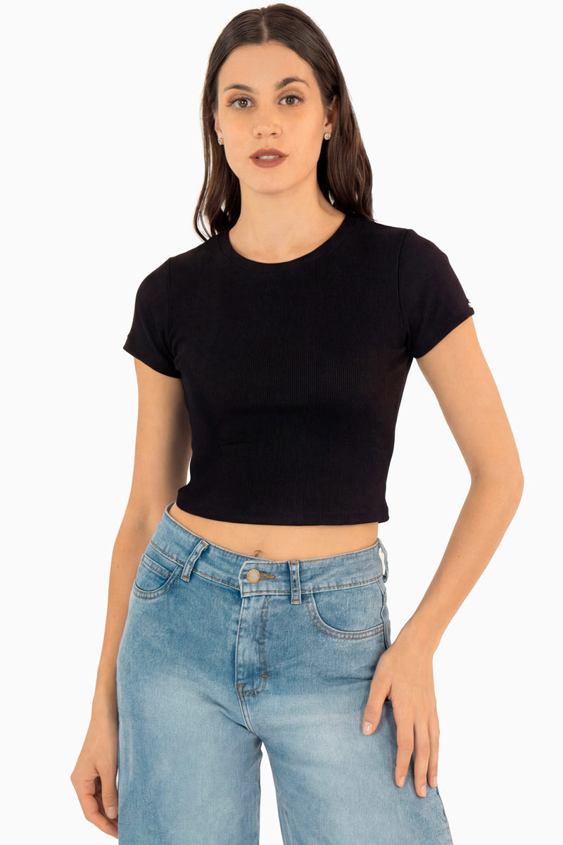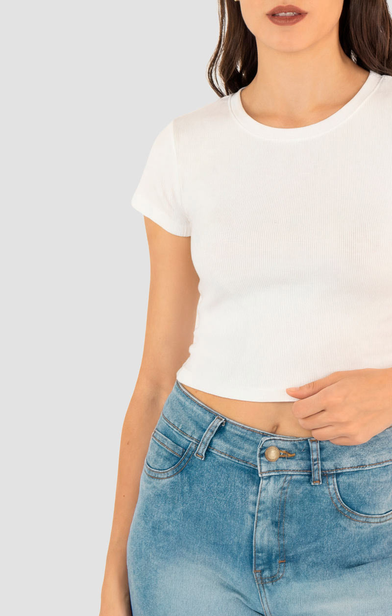 Playera básica para mujer con corte ajustado y diseño versátil. Perfecta para crear looks frescos y modernos, ya sea con jeans para un estilo casual o con pantalón de vestir para un outfit más formal.