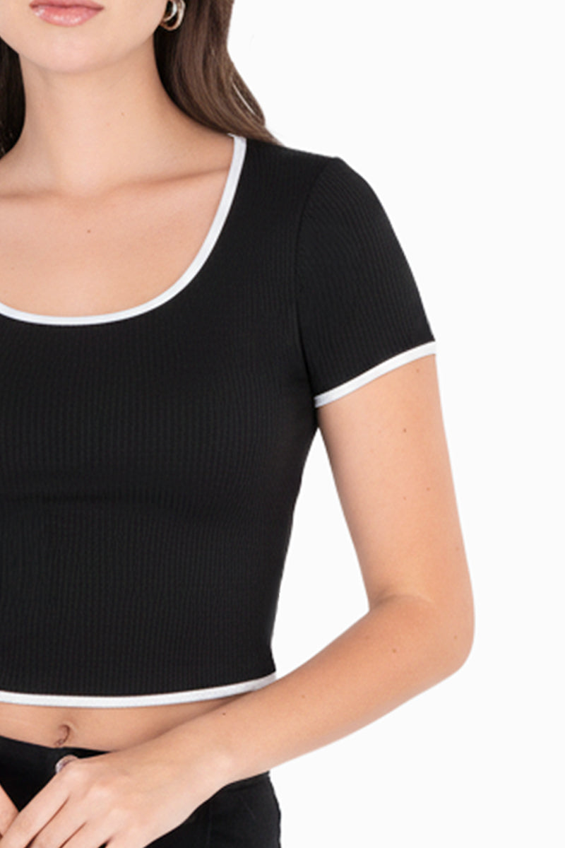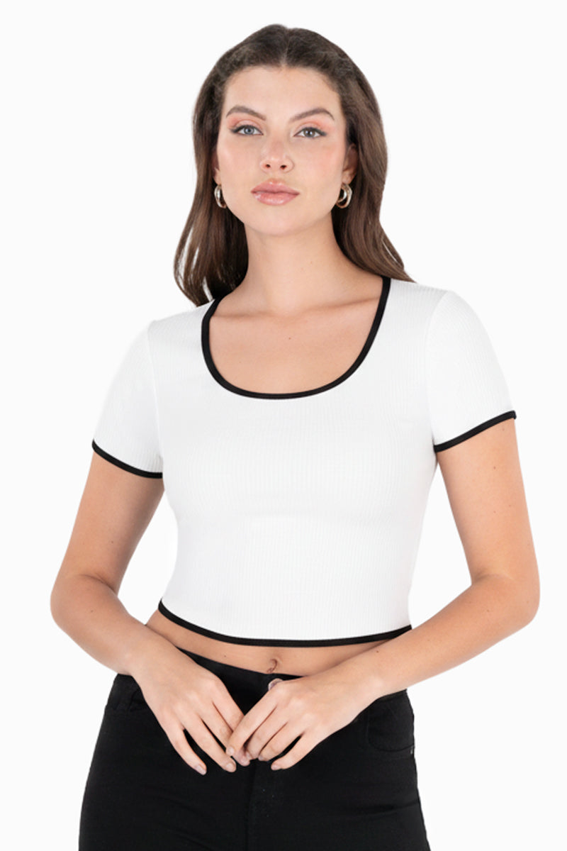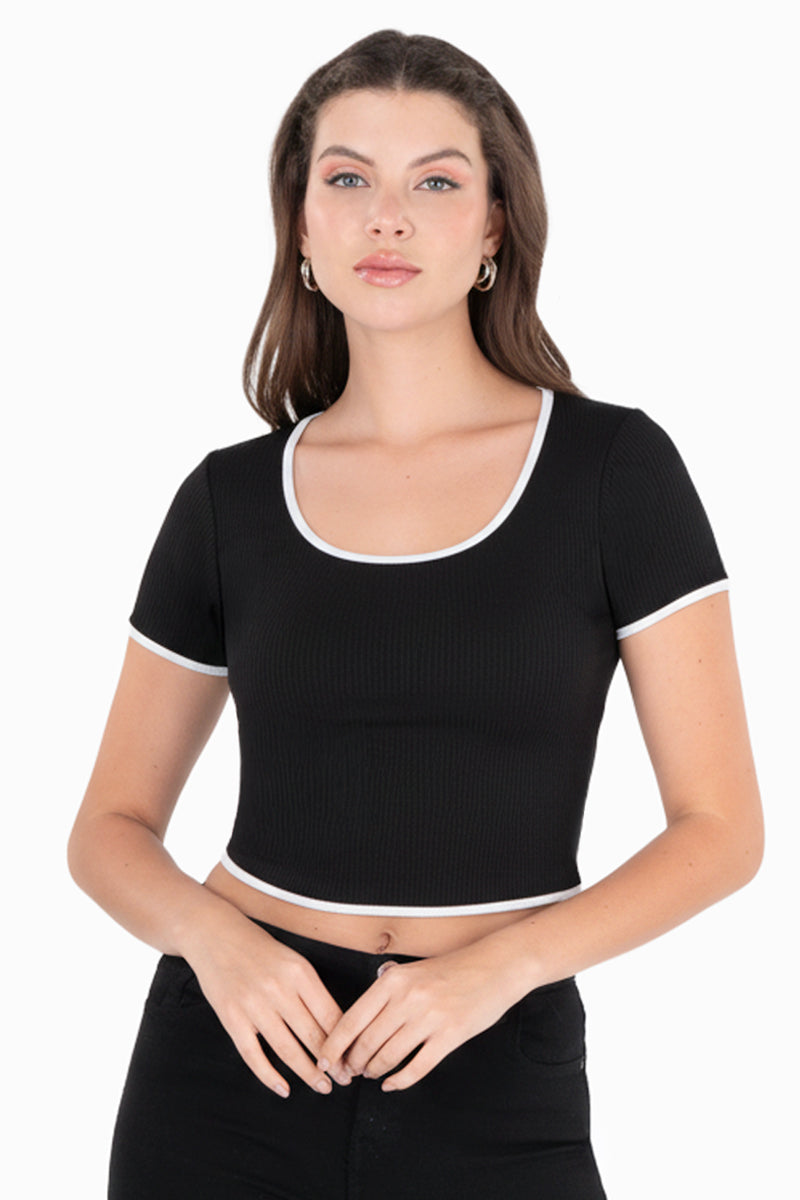 Playera crop acanalada con bies en contraste que realza la silueta y aporta un contraste moderno. Su diseño ajustado y cómodo la hace ideal para looks casuales y urbanos, perfecta para combinar con jeans de tiro alto, faldas o pantalones amplios.