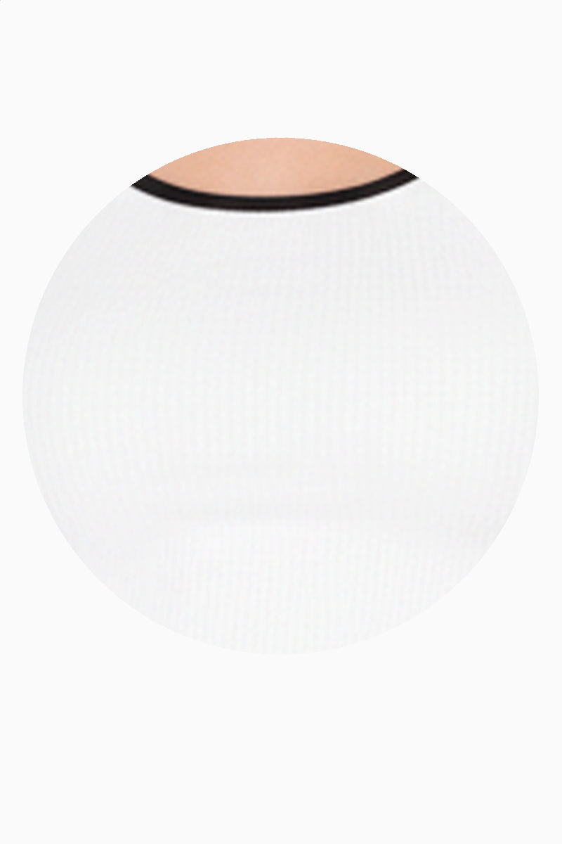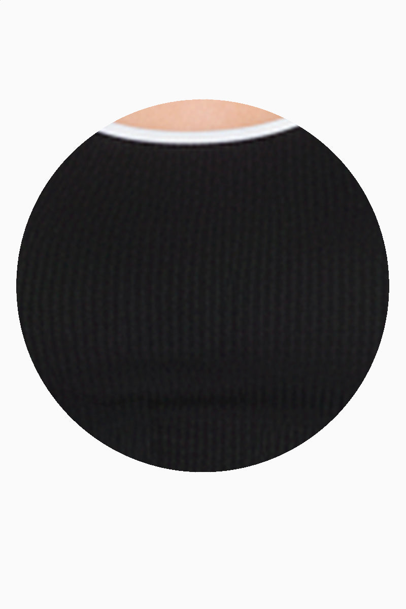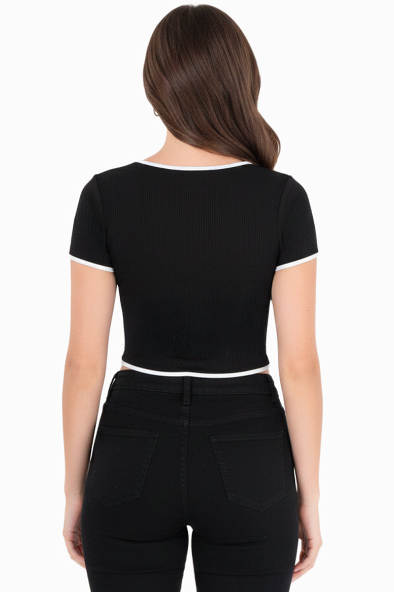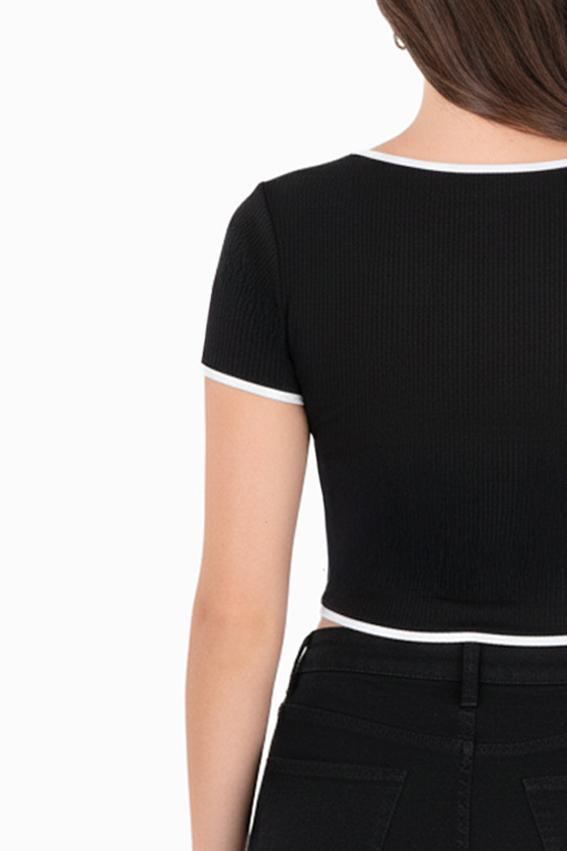 Playera crop acanalada con bies en contraste que realza la silueta y aporta un contraste moderno. Su diseño ajustado y cómodo la hace ideal para looks casuales y urbanos, perfecta para combinar con jeans de tiro alto, faldas o pantalones amplios.