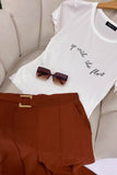 Playera manga corta con escote redondo, estampada y festoneada de las orillas.