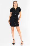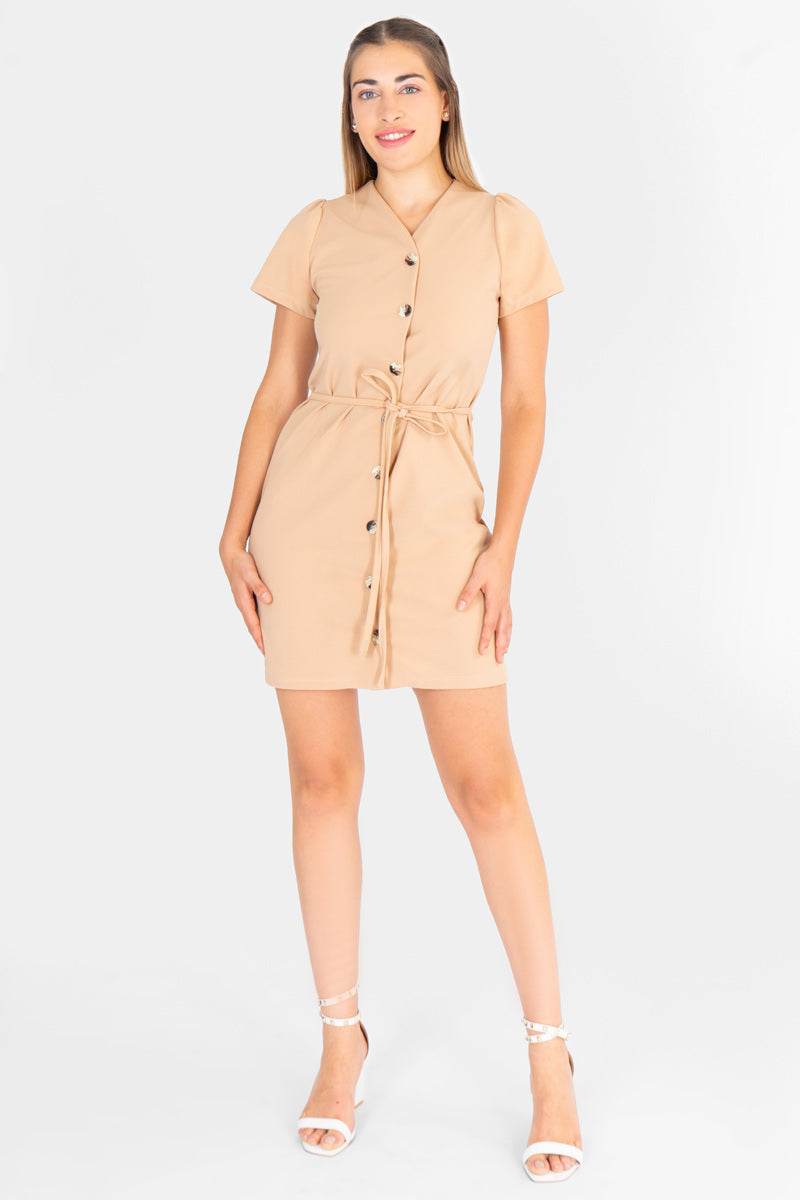 Vestido liso, manga corta abullonada con aletilla, cinto y botones.